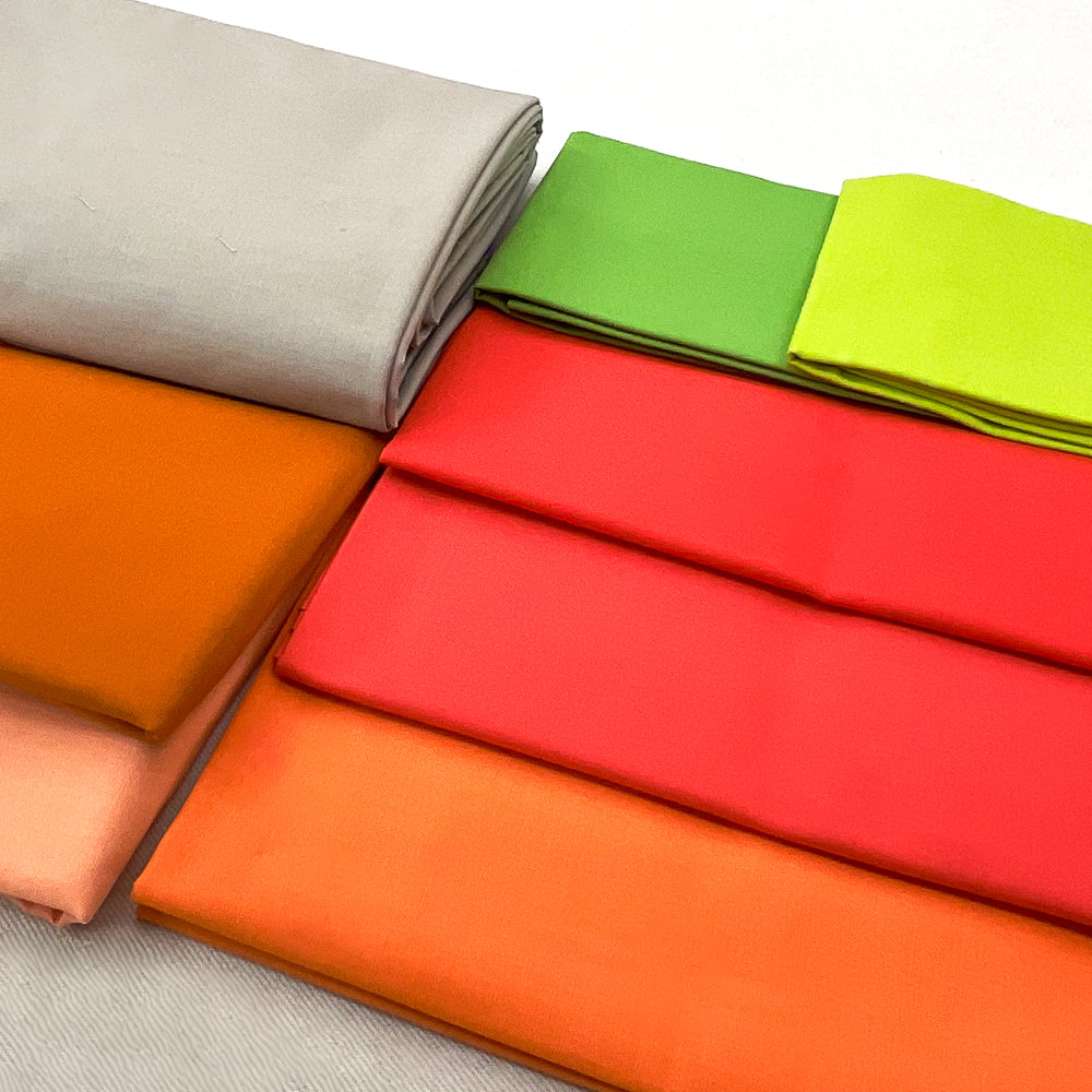 - Bundle fabrics include: 1/2 yard peach solid, 1/2 yard antique orange solid, 1/2 yard pumpkin orange solid, 1/2 yard red orange solid, 1/4 yard lime green solid, 1/4 yard apple green solid, 1/2 yard apricot red orange solid, 3 7/8 yards gray solid. Pattern is not included.
