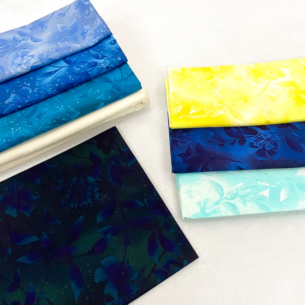 - Bundle fabrics include: 5/8 yard dark blue on blue tonal floral, 5/8 yard yellow tonal floral, 3/8 yard moss purple tonal floral, 3/4 yard royal blue tonal floral, 7/8 yard teal tonal floral, 1 yard chambray tonal floral, 1 3/4 yards white aqua floral, 8 yards ivory solid. Pattern is not included.
