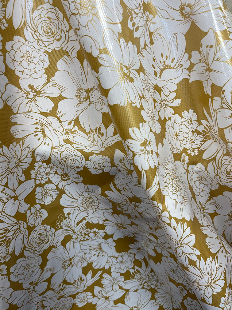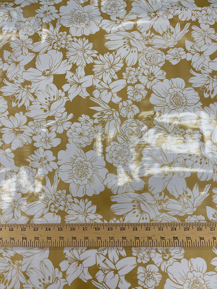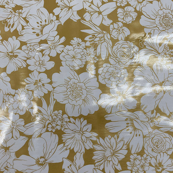 White Floral Print on Metallic Gold Oilcloth Fabric