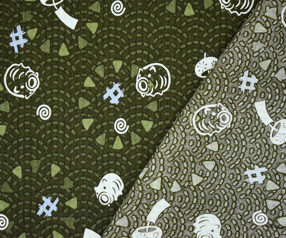 -100% cotton plain woven shirting fabric with a crinkled feel printed with an abstract pattern featuring a pig-like figure abstract shapes, & more. Line if needed.
