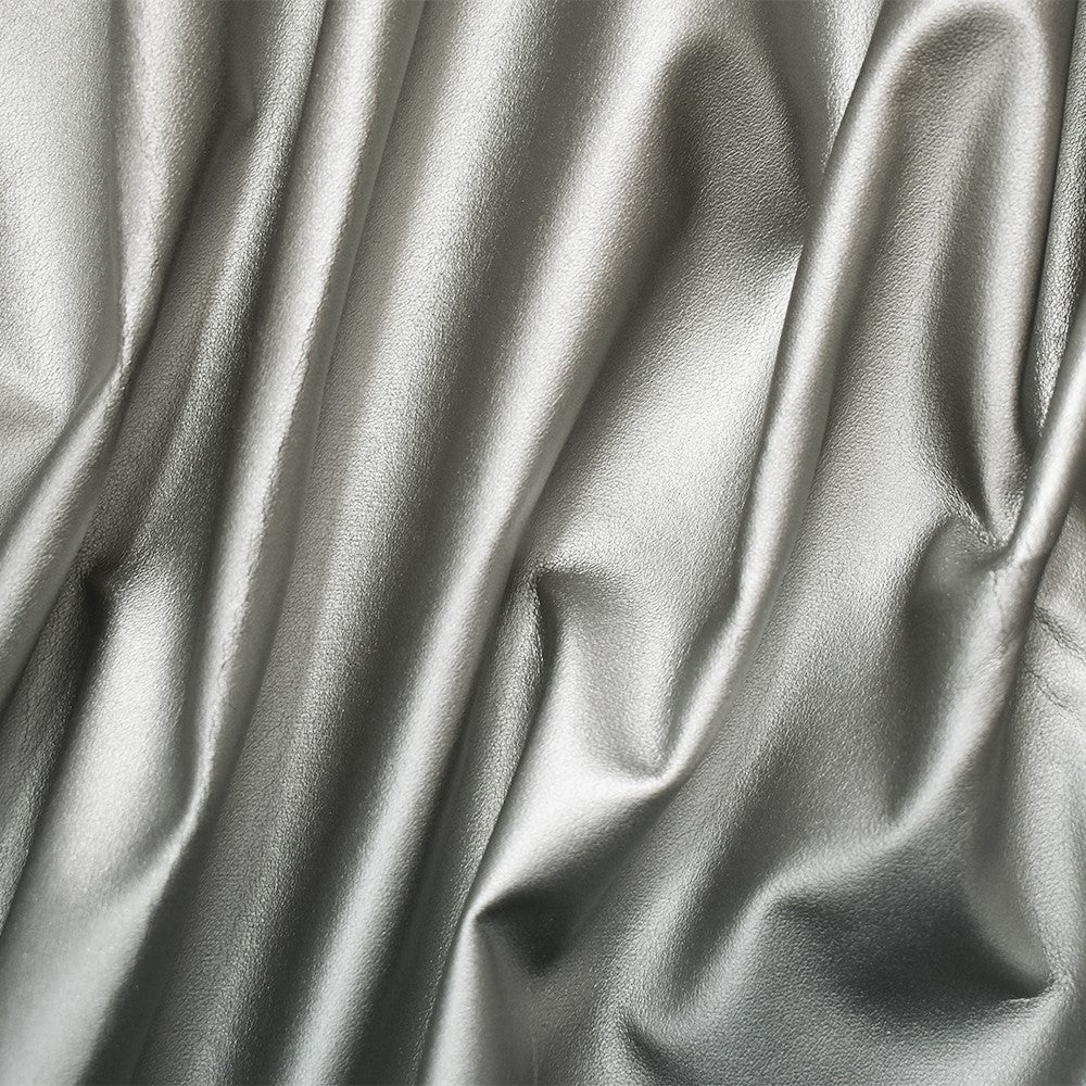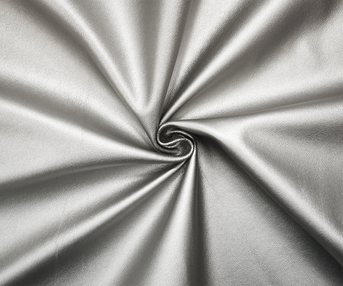 -Solid metallic silver faux leather finish on a stretch woven fabric home decorating fabric