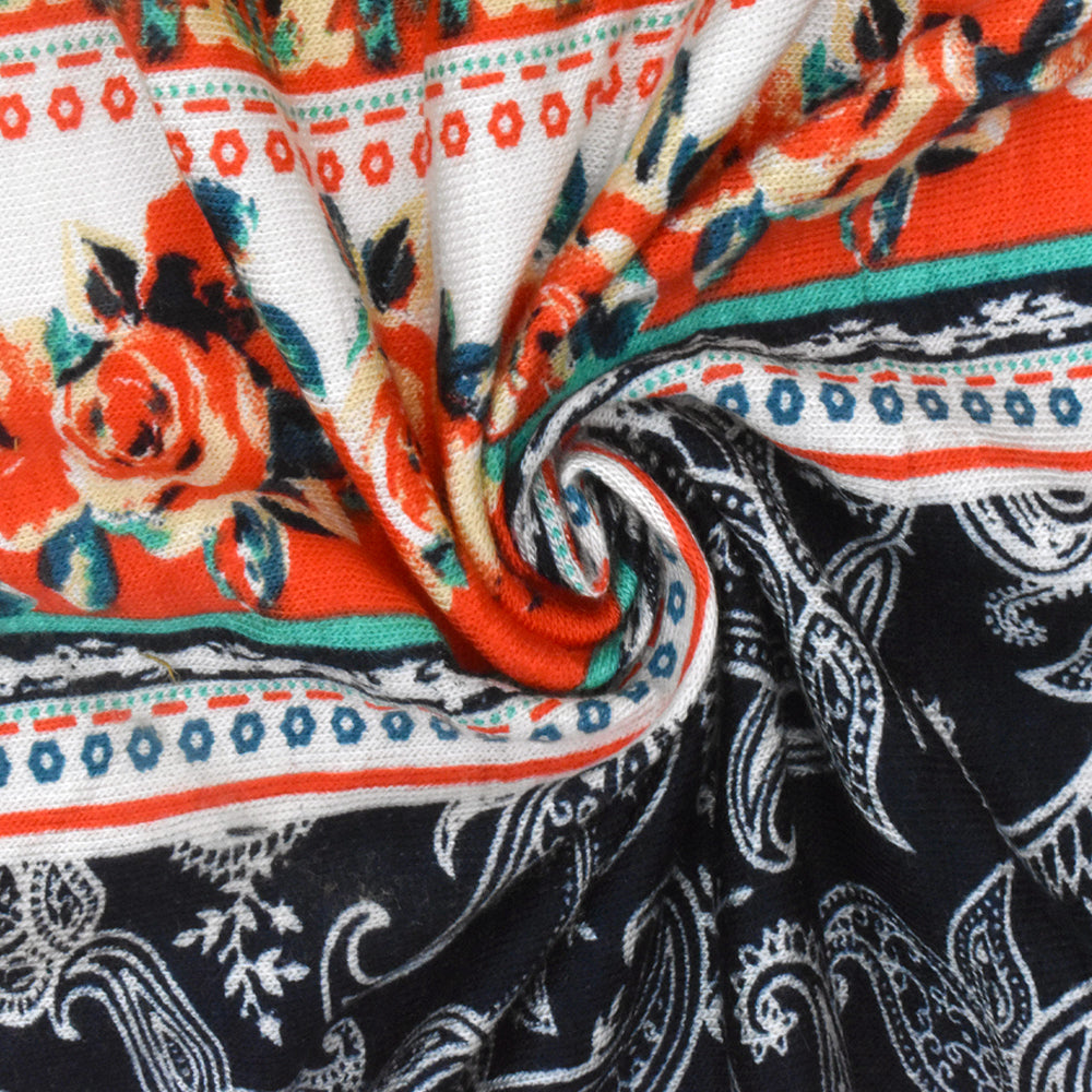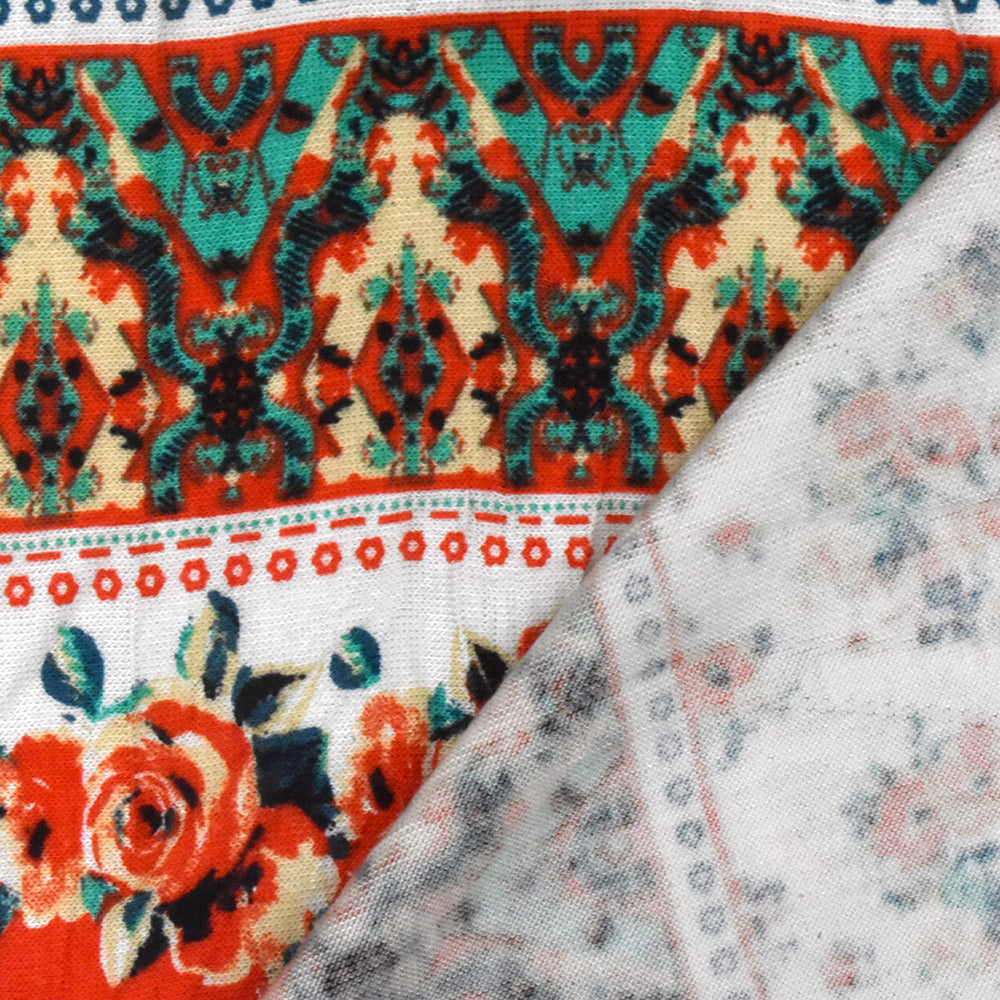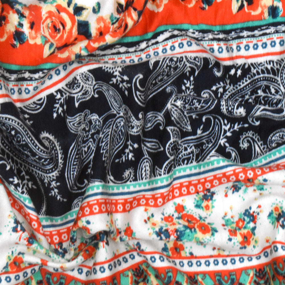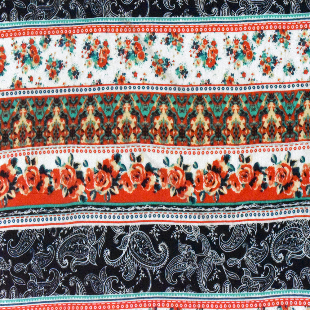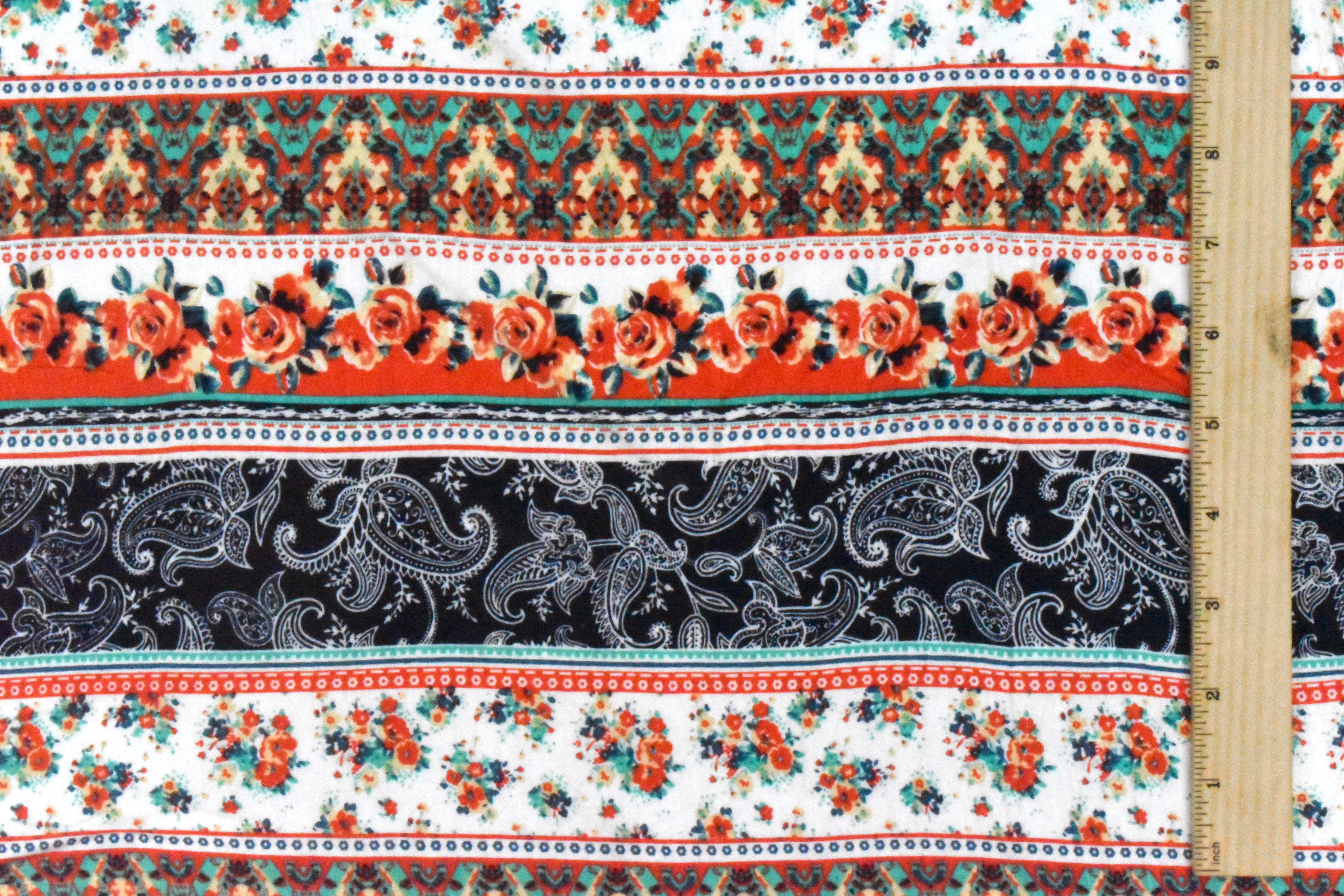 -Floral, paisley and aztec elements in a striped arrangement printed on a stretch jersey knit fabric