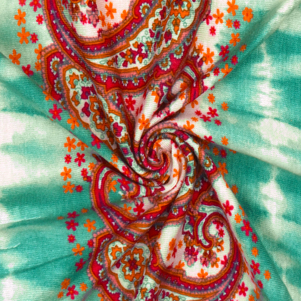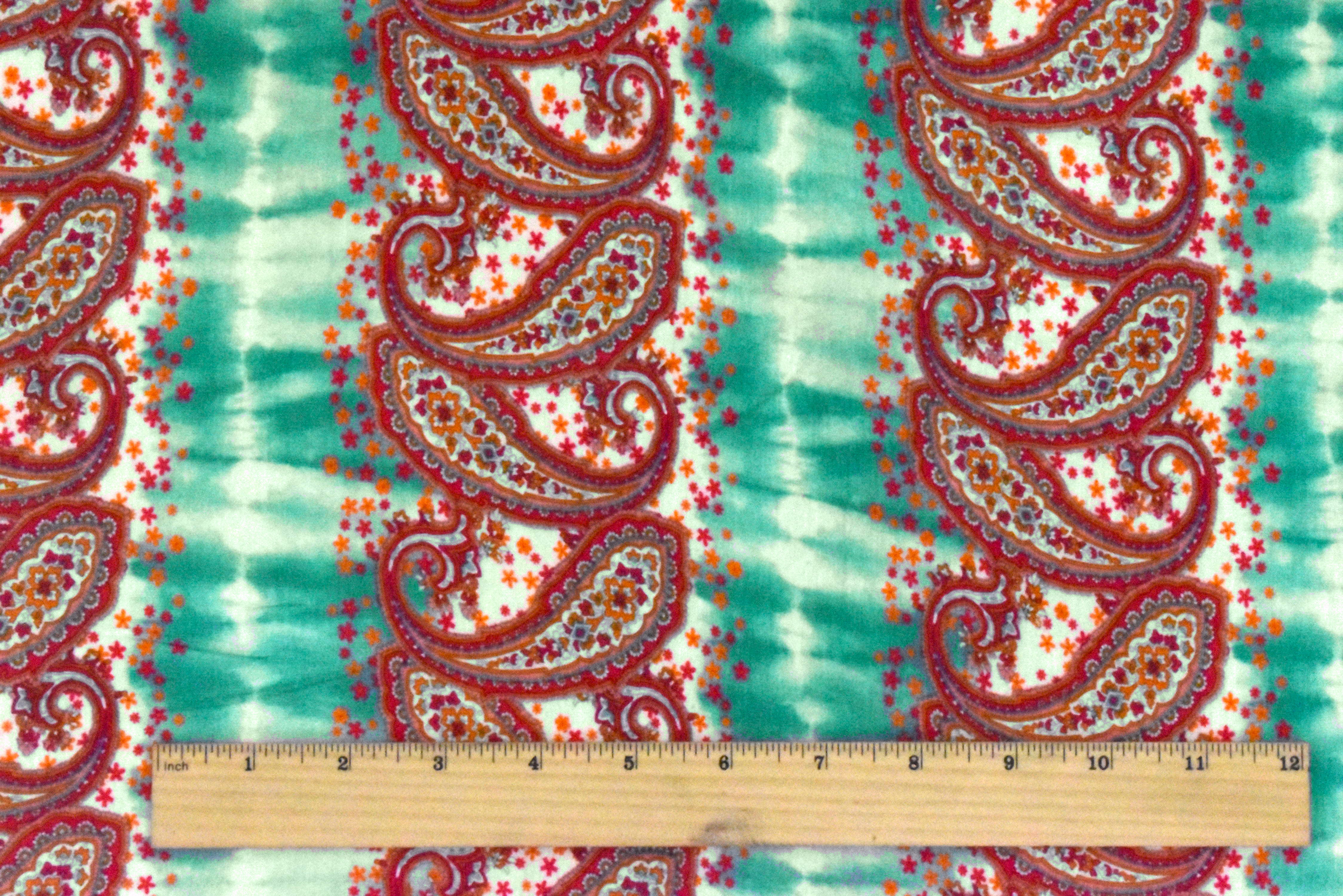 Teal-Red-Multi Striped Paisley Printed Rayon Stretch Jersey Knit Fabric