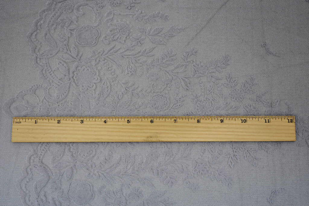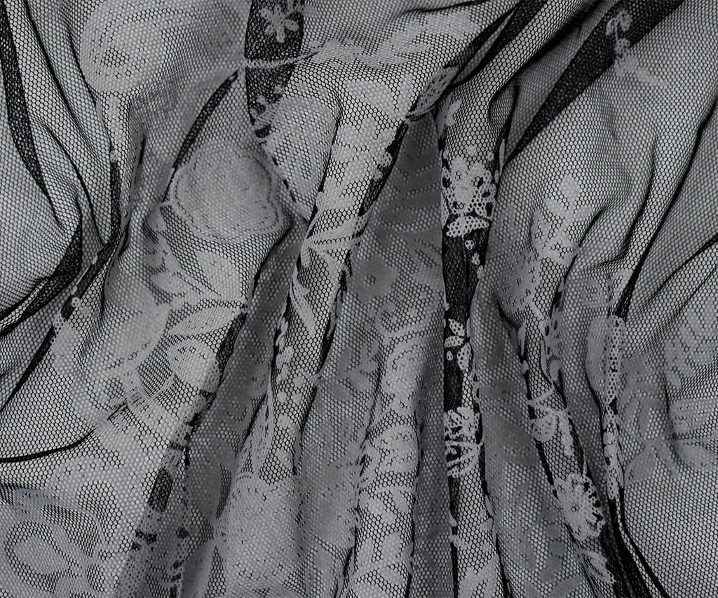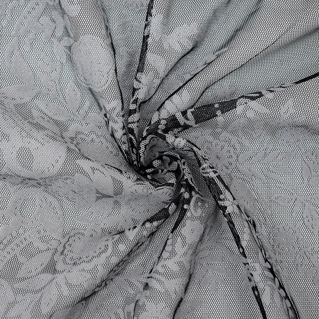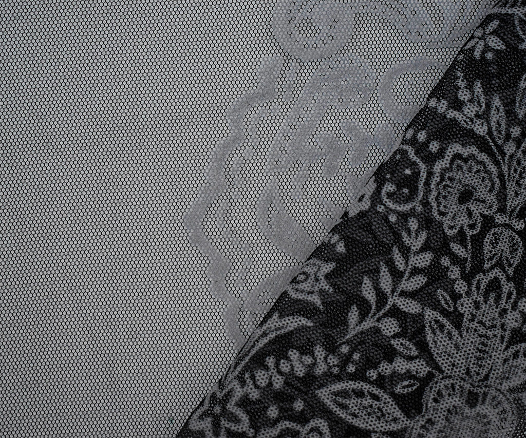 Black-White Nylon Floral Border Scallop Printed Mesh Tulle Knit Fabric
