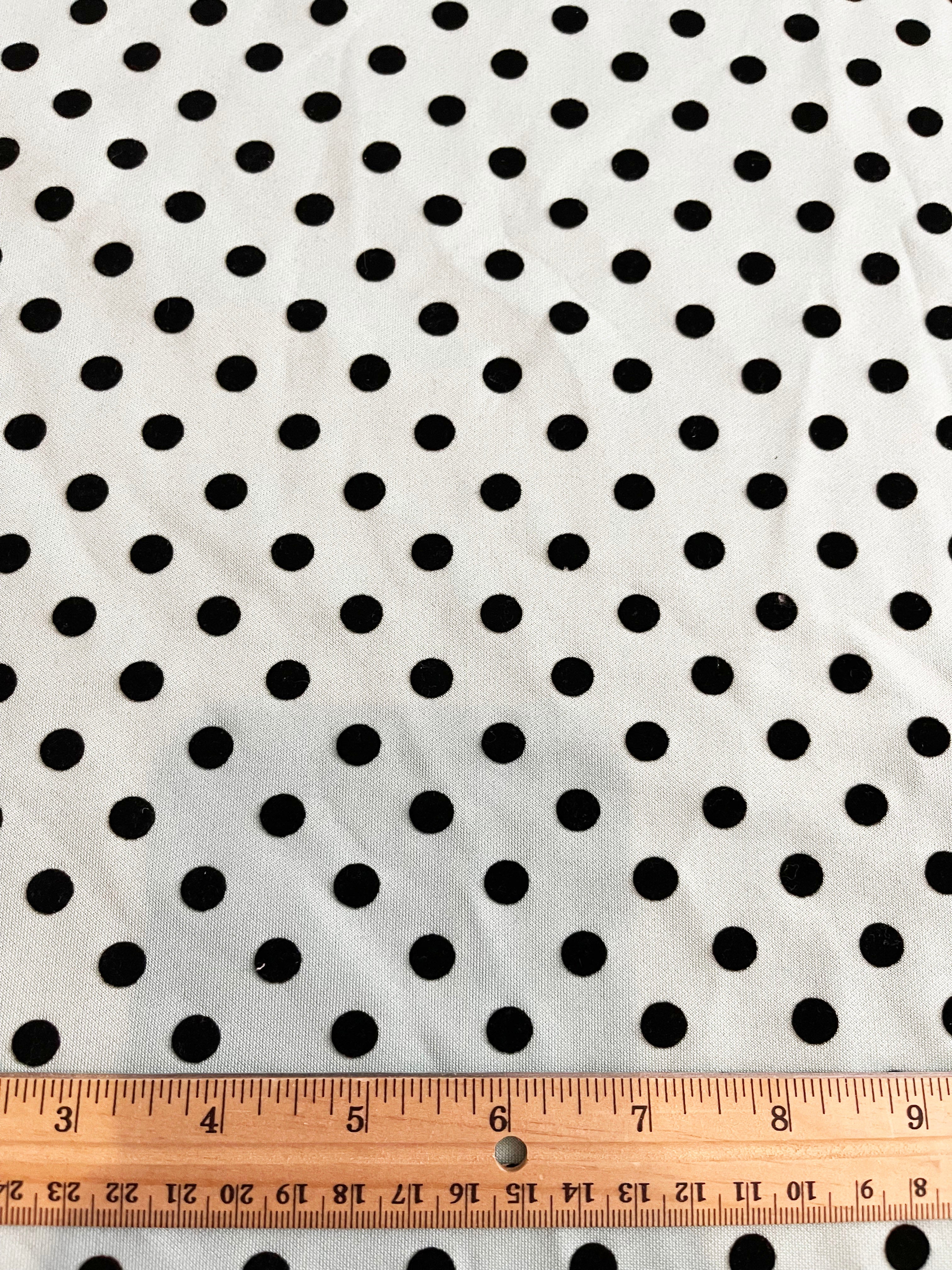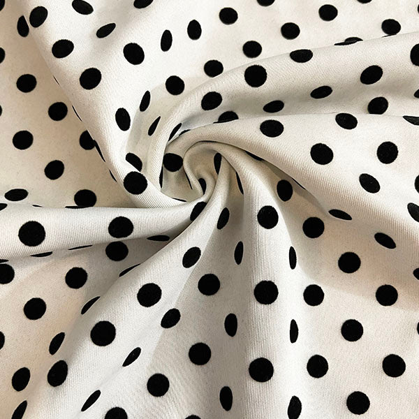 -Black Velvet Flocked Polka Dot on White Scuba Knit Fabric-Weight: Light - Medium-Transparency: Opaque-Hand: Textured-Stretch: Horizontal Stretch-Drape: Little Drape-Luster: Matte-End Uses: Apparel, Activewear, Dresses-Compare to $18.00/yd