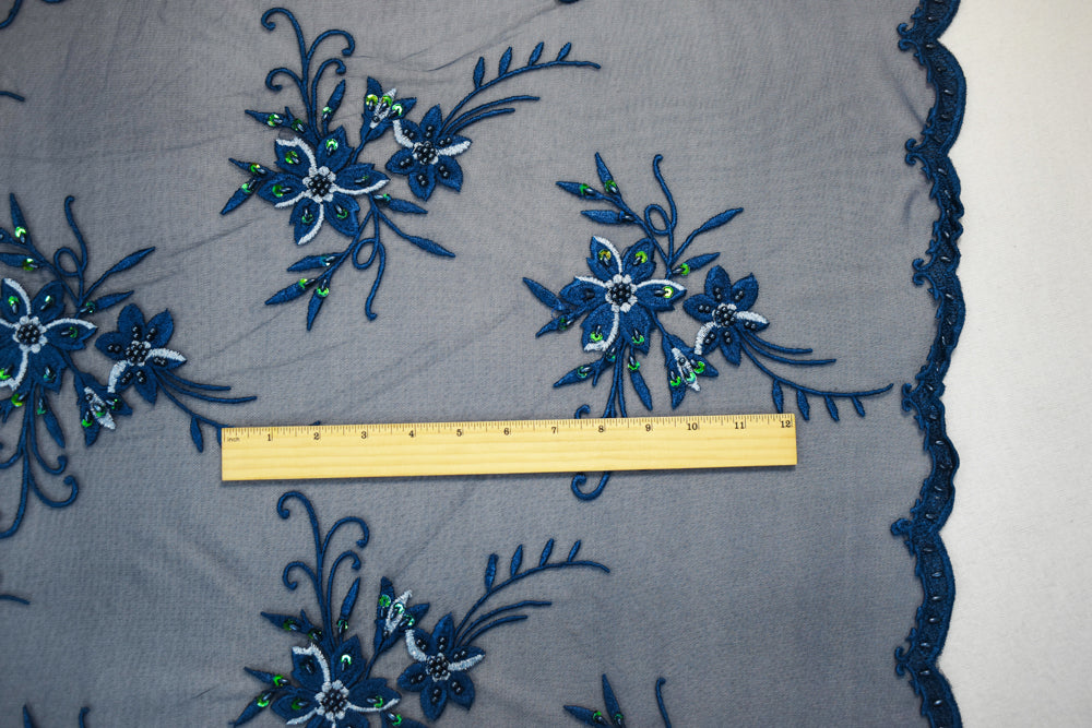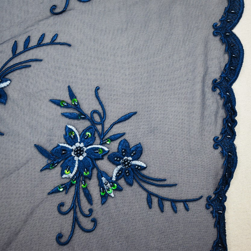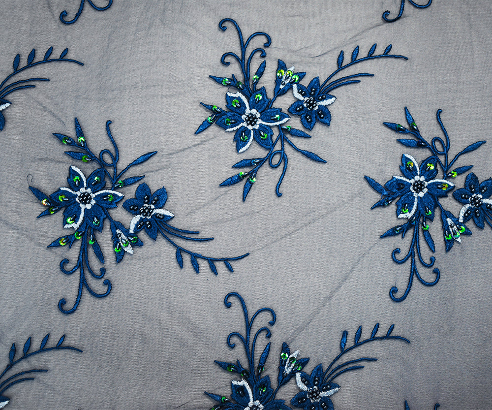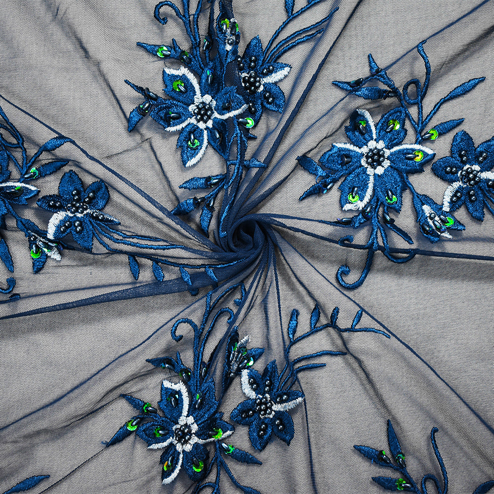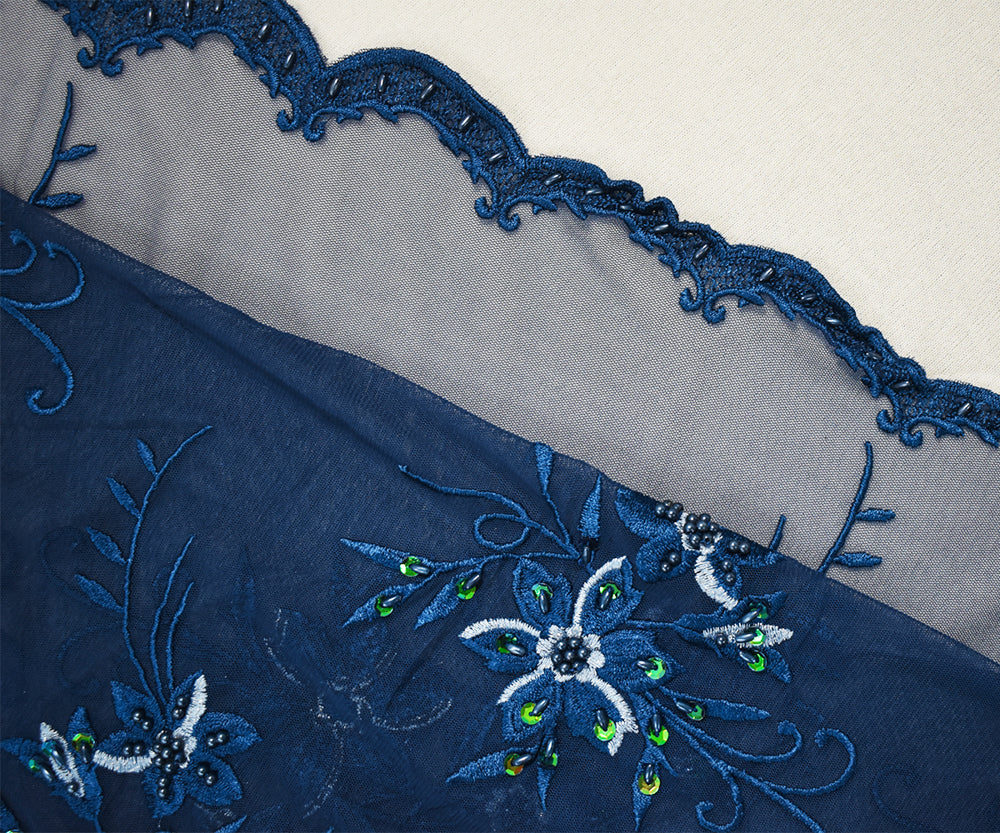 Deep Blue-Green Polyester Embroidered Floral Bead Sequin Mesh Tulle Fabric