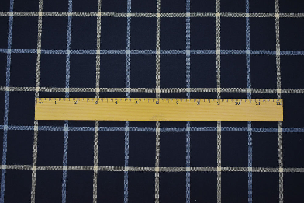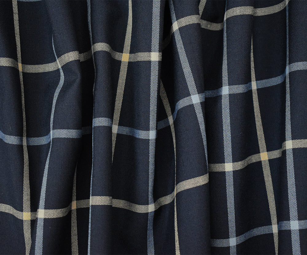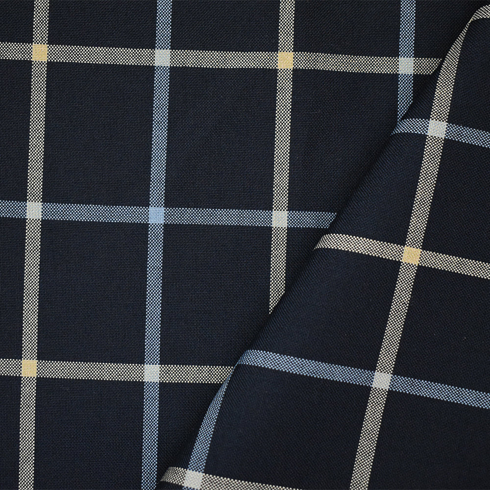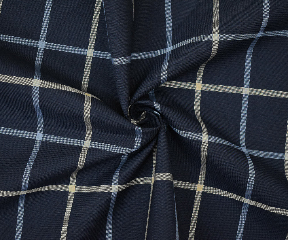 Navy-Light Blue-Beige Poly-Wool Blend Check Shirting Woven Fabric