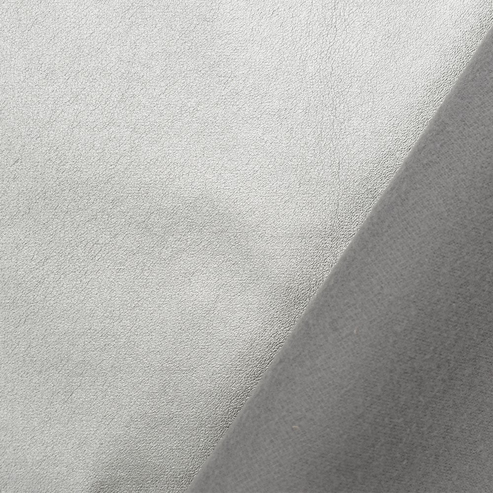 -Solid metallic silver faux leather finish on a stretch woven fabric home decorating fabric