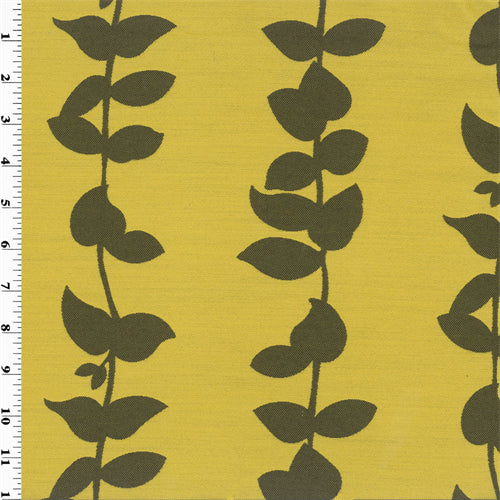 Woven jacquard in yellow and dark brown features leaf vines positioned to create vertical stripe. It has incredibly soft hand and drape ability making it ideal for upholstery, pillows, bedding, and drapery. Either sides of fabric may be used.