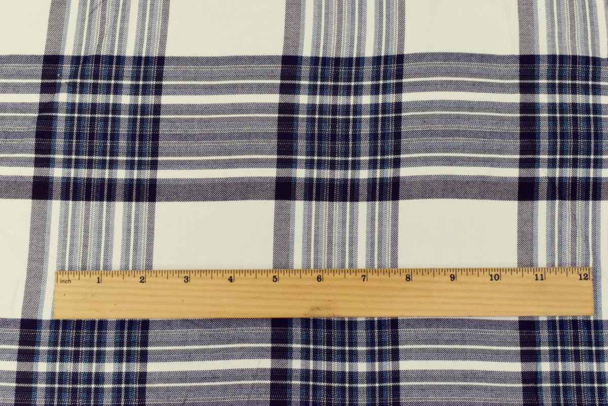 Blue-Ivory-Multi Famous Maker Cotton-Rayon Plaid Twill Shirting Woven Fabric