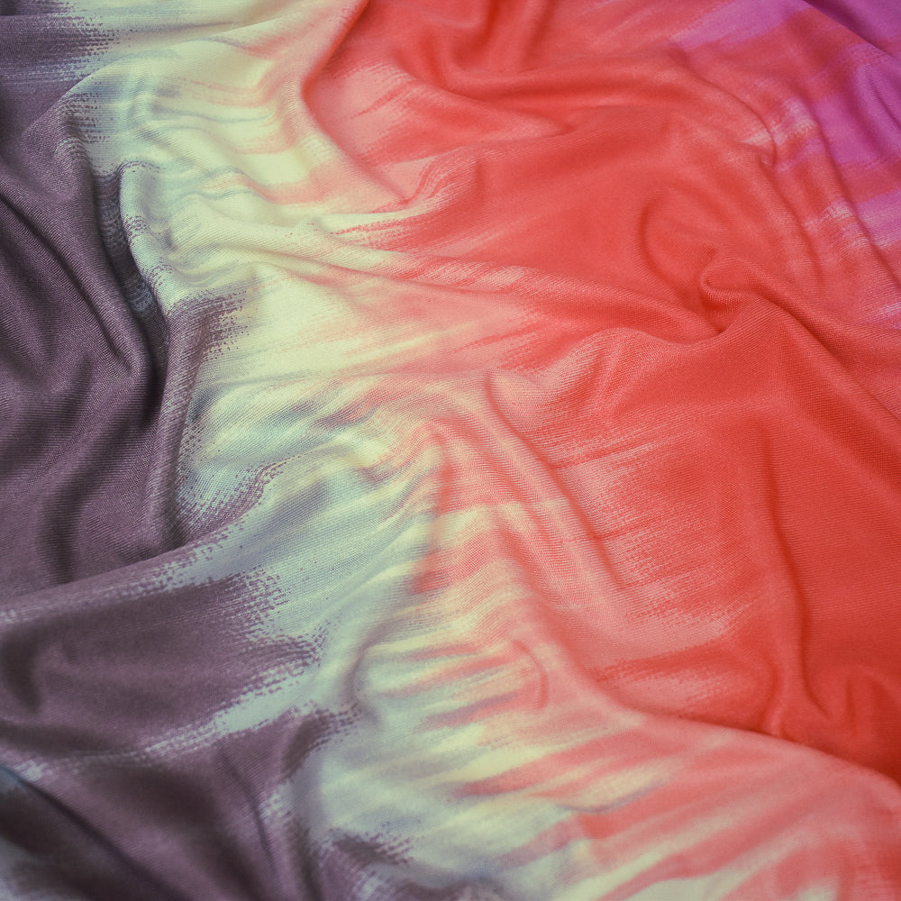 -100% silk jersey knit fabric printed with a tie dye pattern in a striped arrangement. Line if needed.