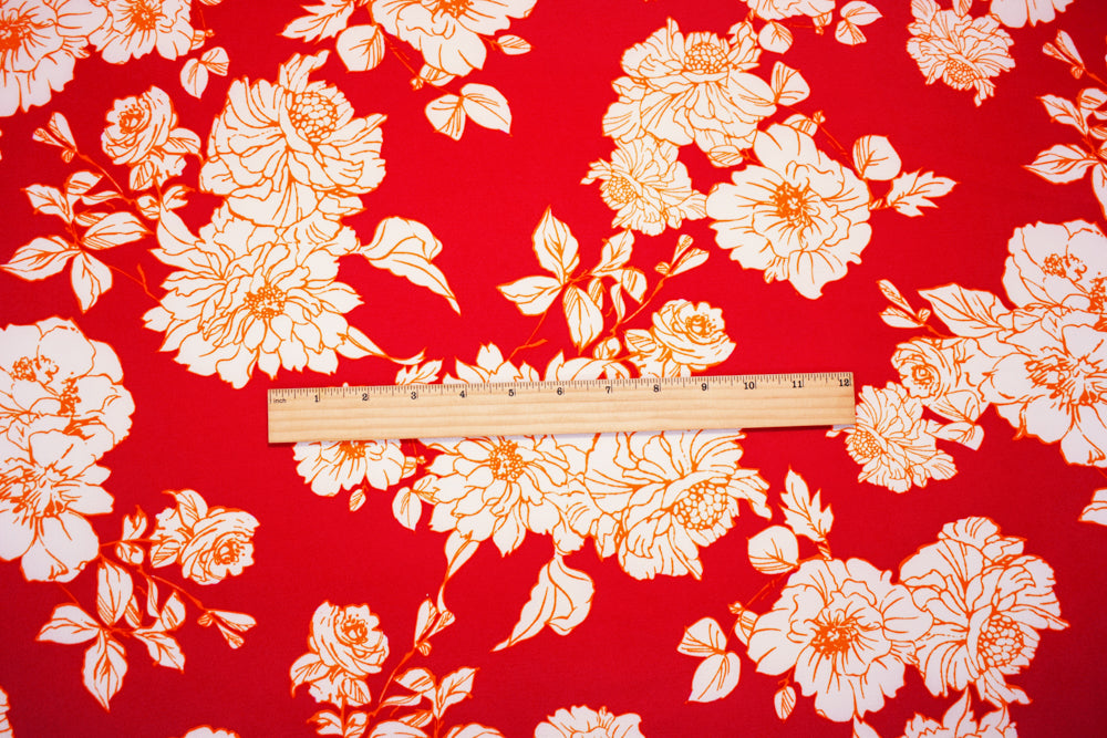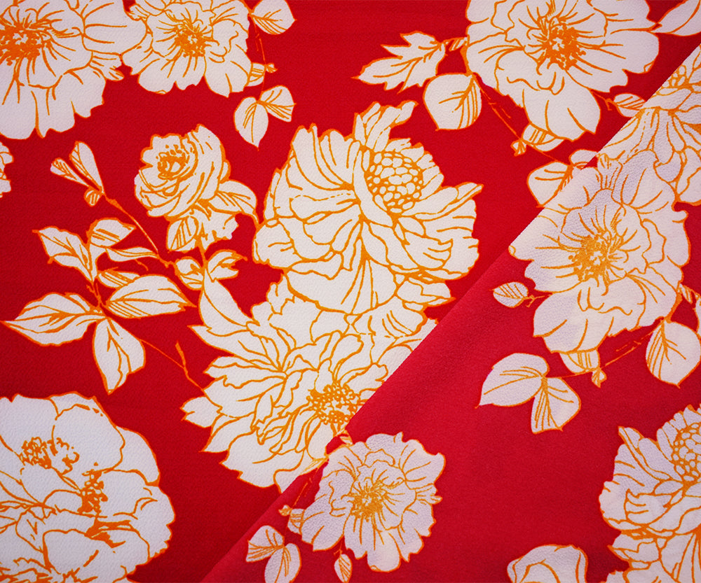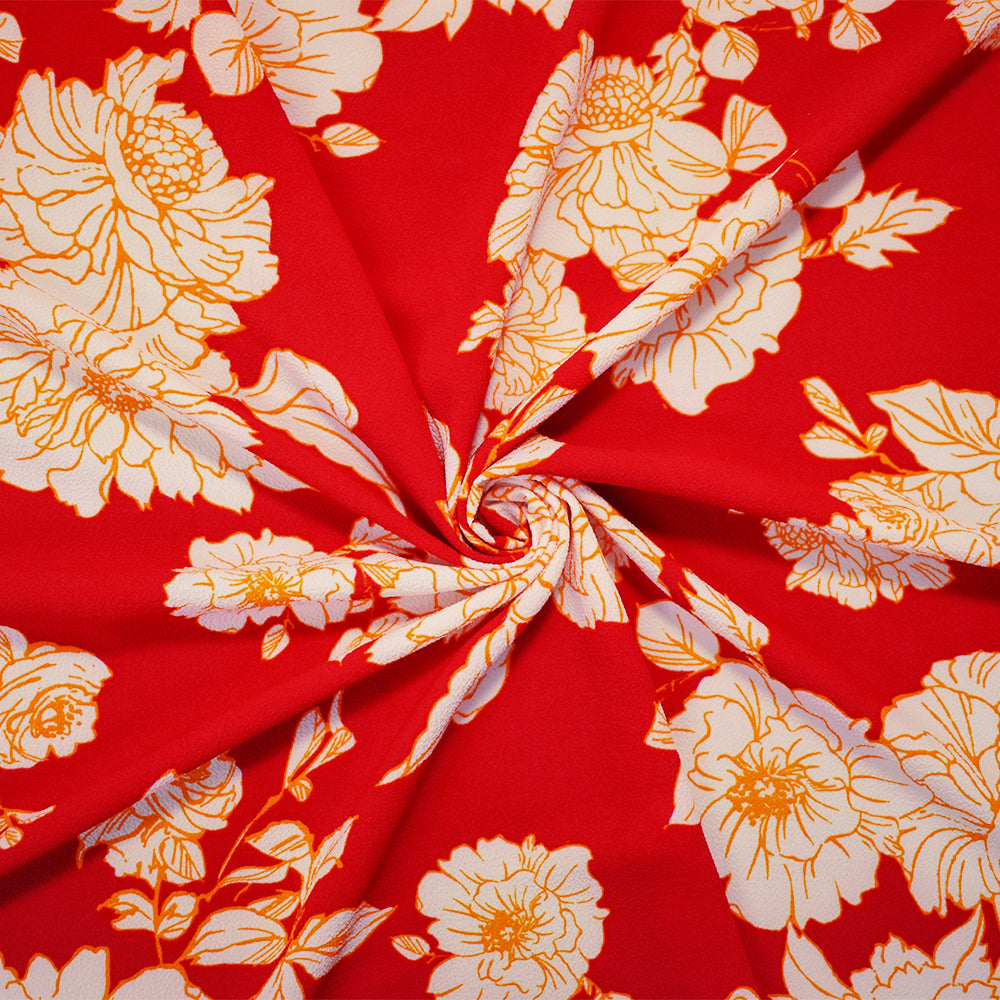5 YD PC-Red-Orange-White Poly Floral Printed Pebble Crepe Woven Fabric