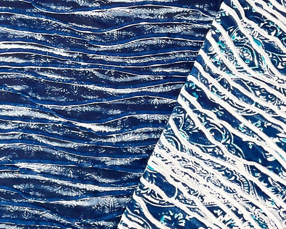 Blue-White Poly Baroque Floral Border Printed Knife Pleat Knit Fabric