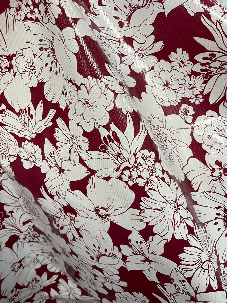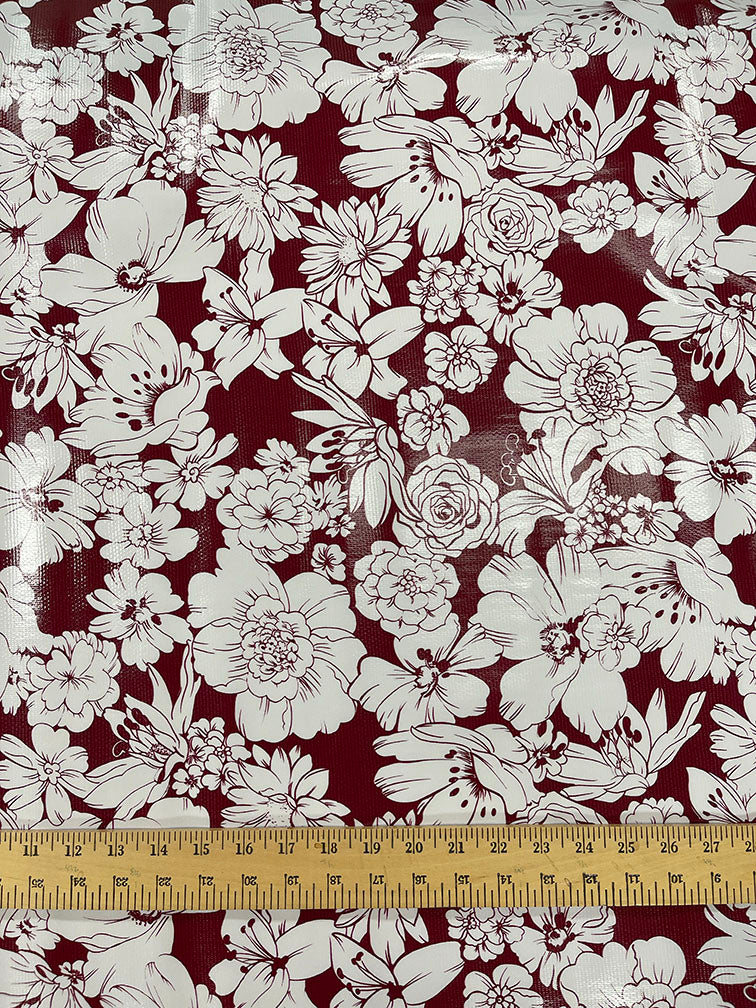 White Floral Print on Wine (Burgundy/Red) Oilcloth Fabric