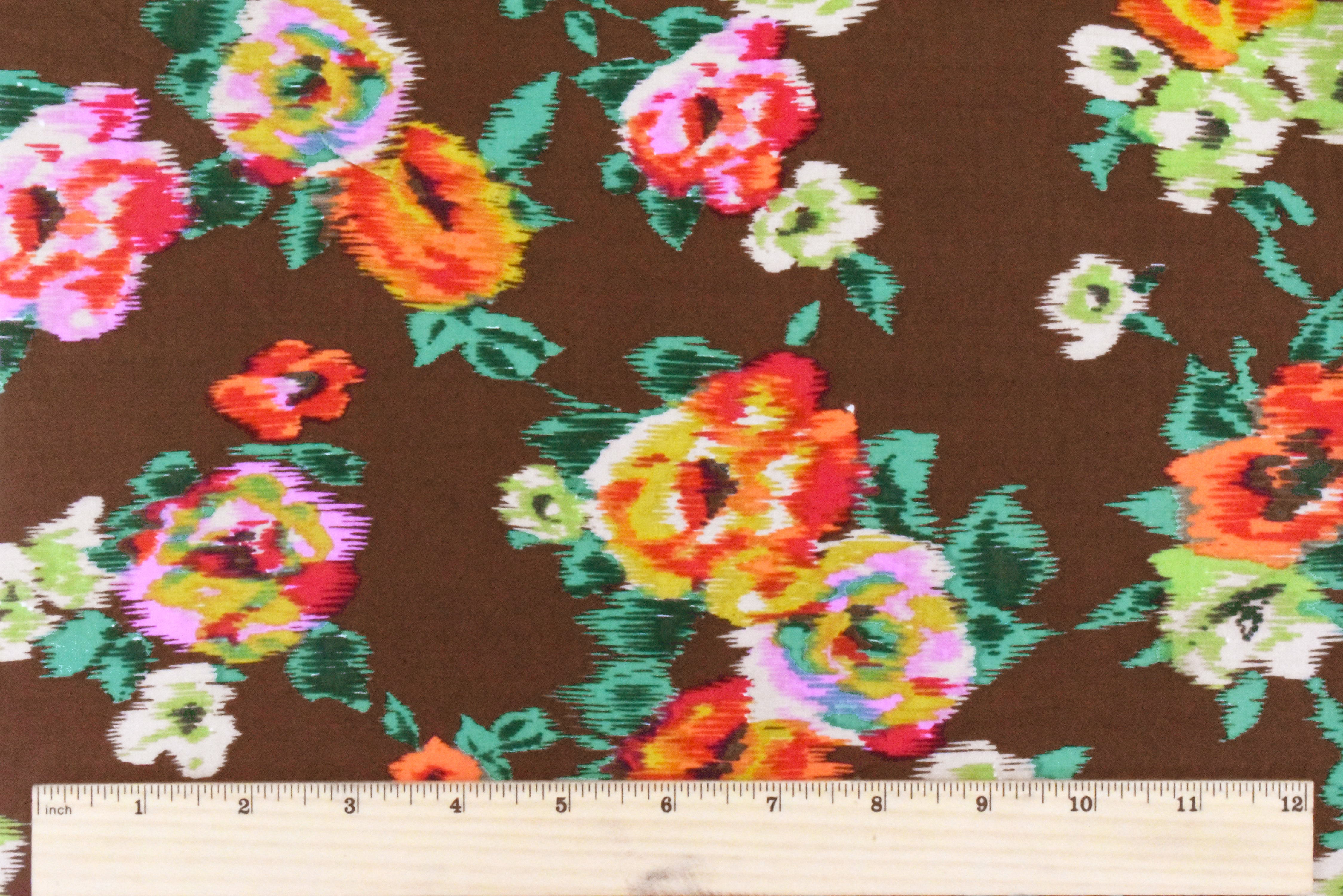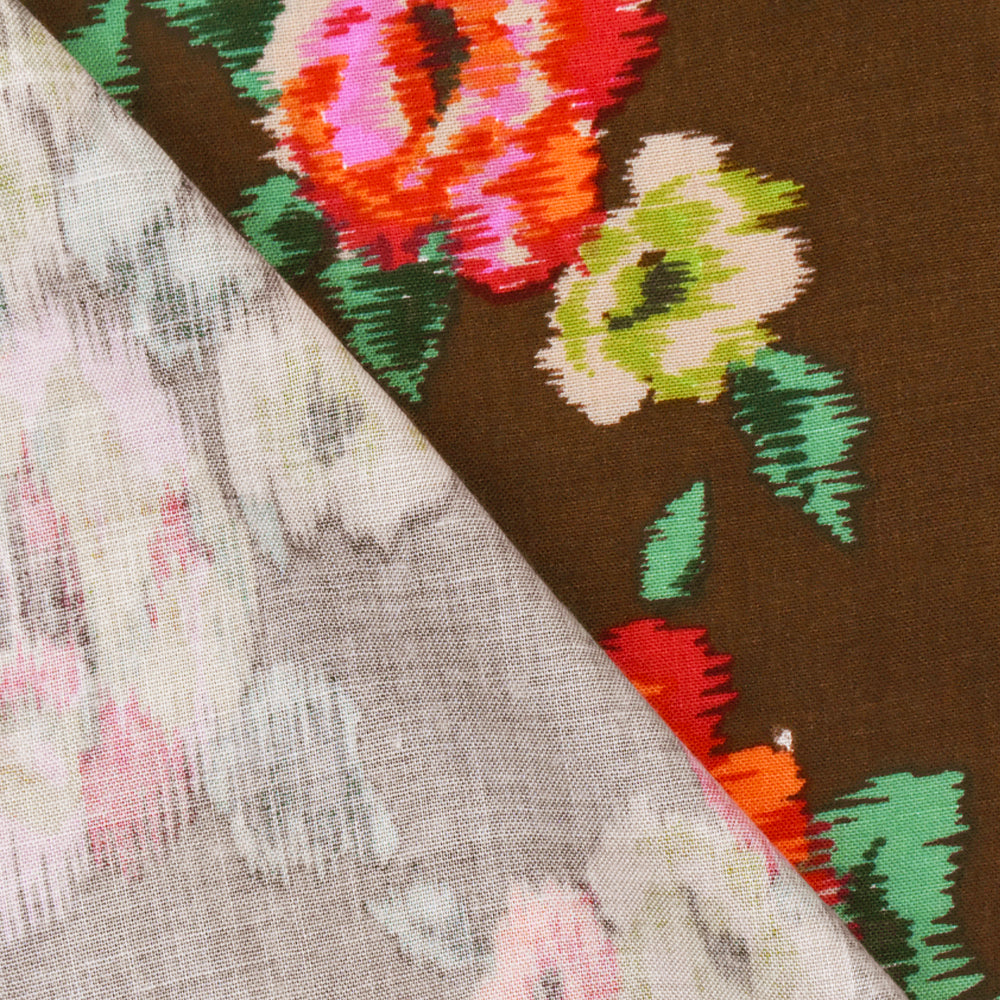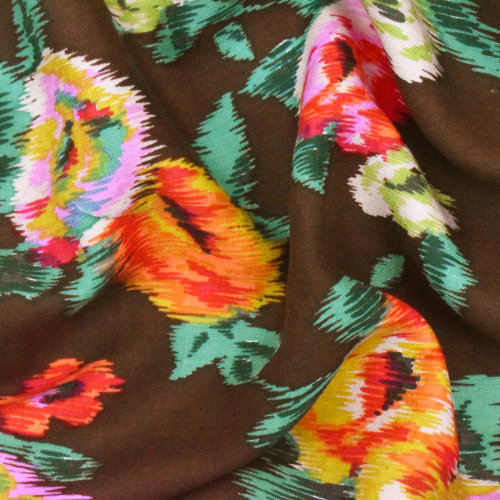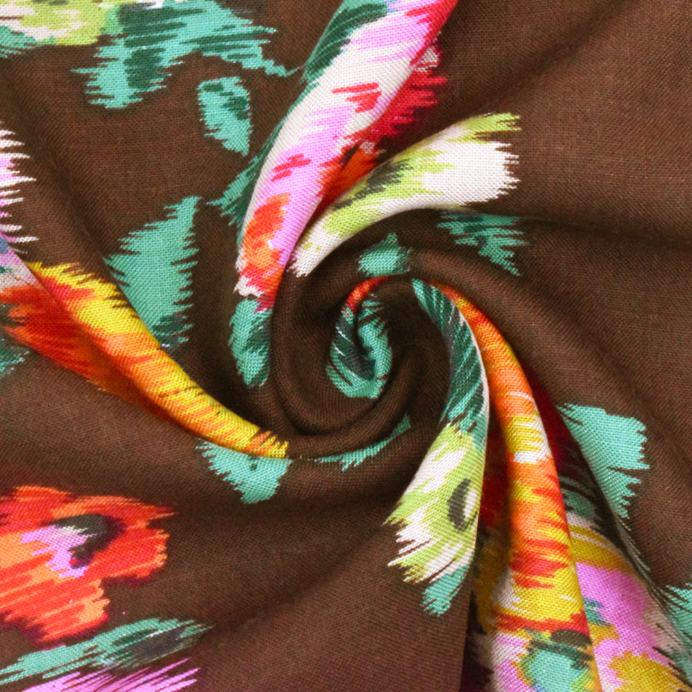 Brown-Green-Multi Ikat Floral Printed Challis Woven Fabric