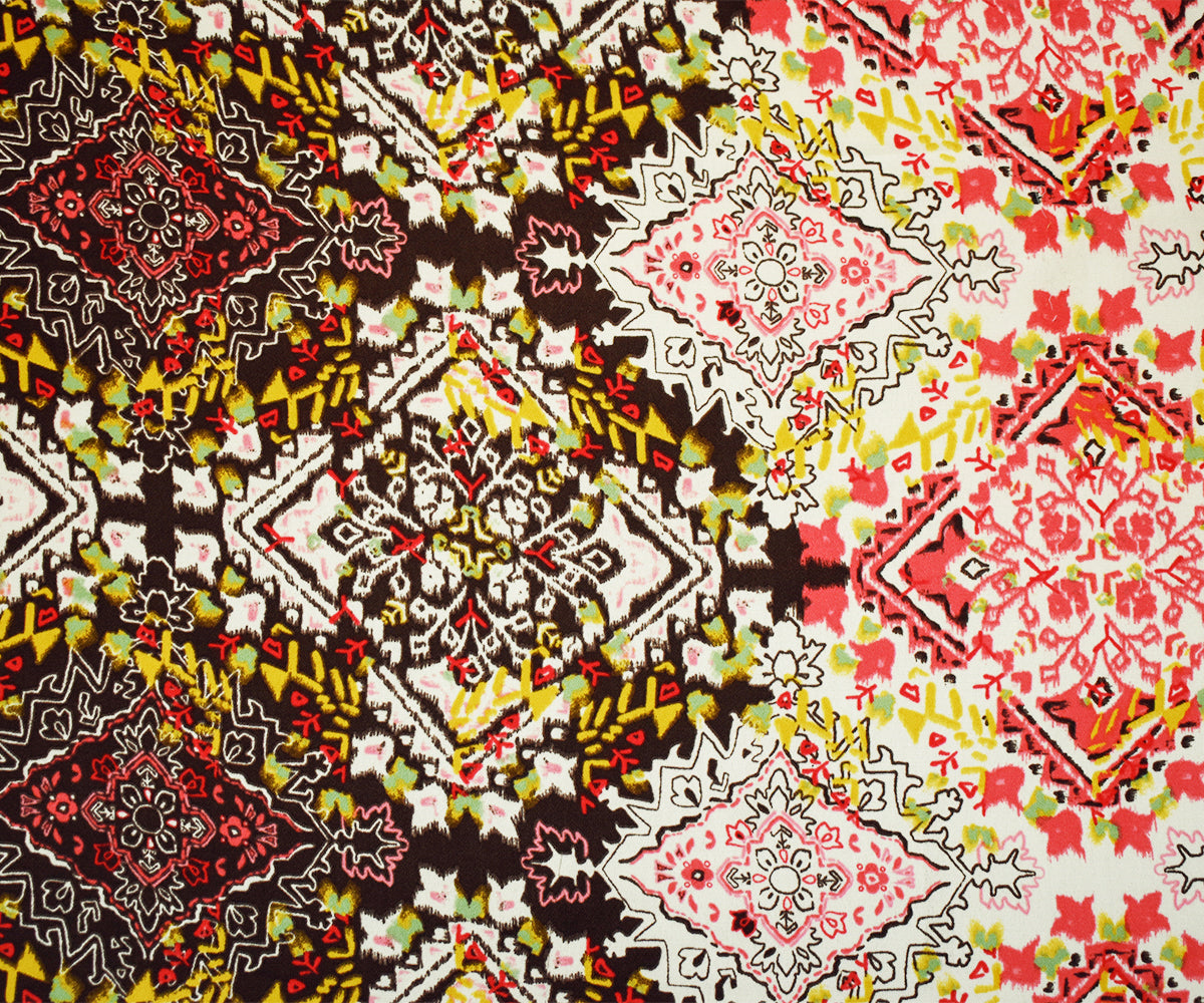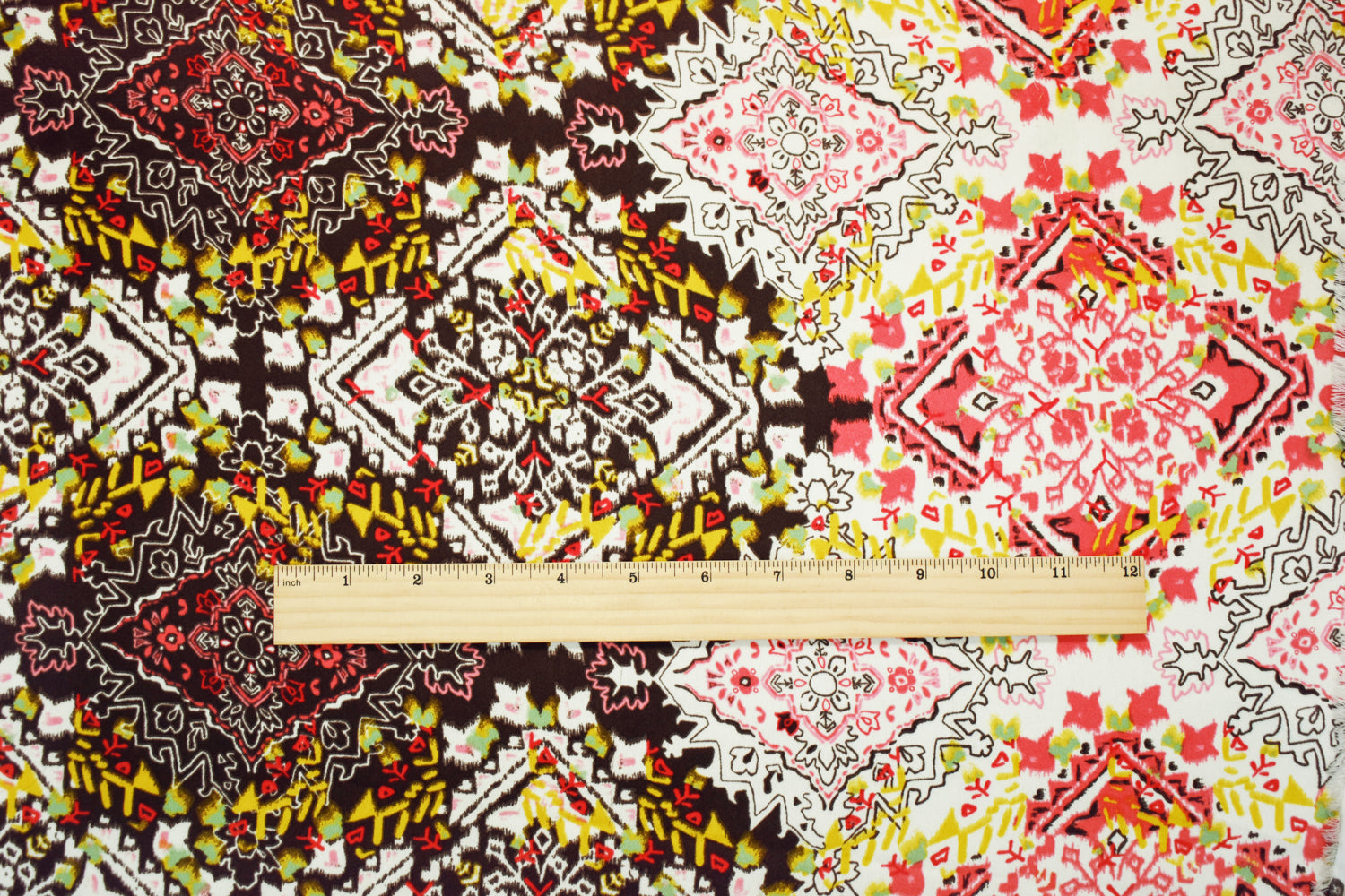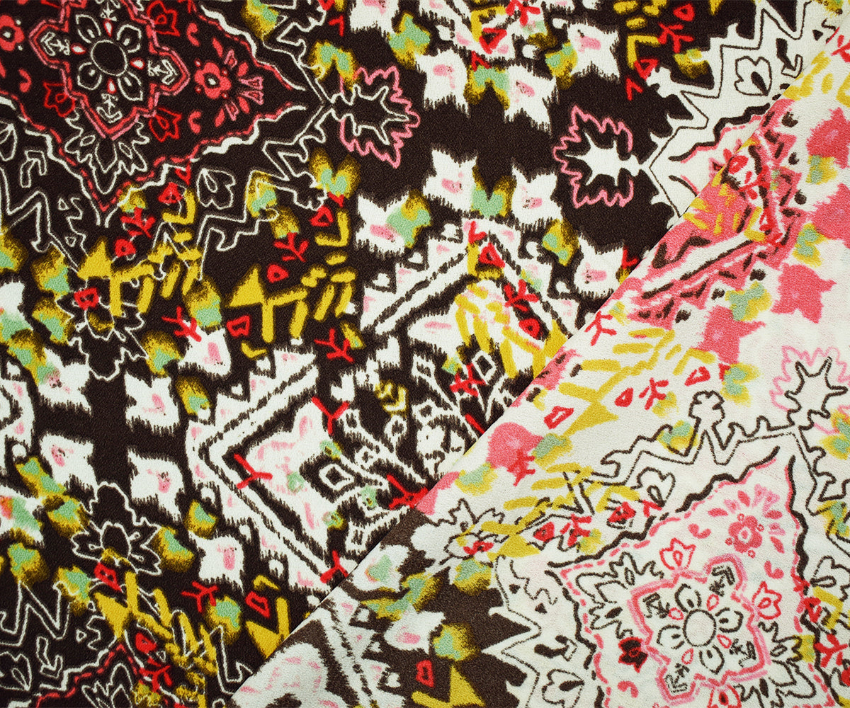 -100% Polyester georgette momie crepe dobby woven fabric printed with an Aztec inspired pattern with floral and diamond elements