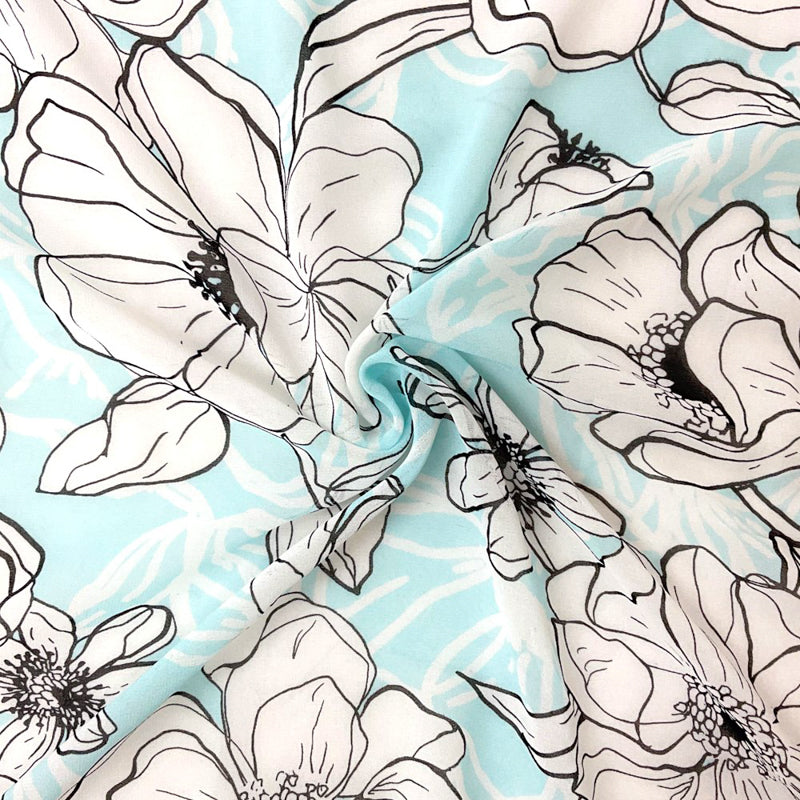 Blue-White-Black Poly Floral Printed Chiffon Woven Fabric
