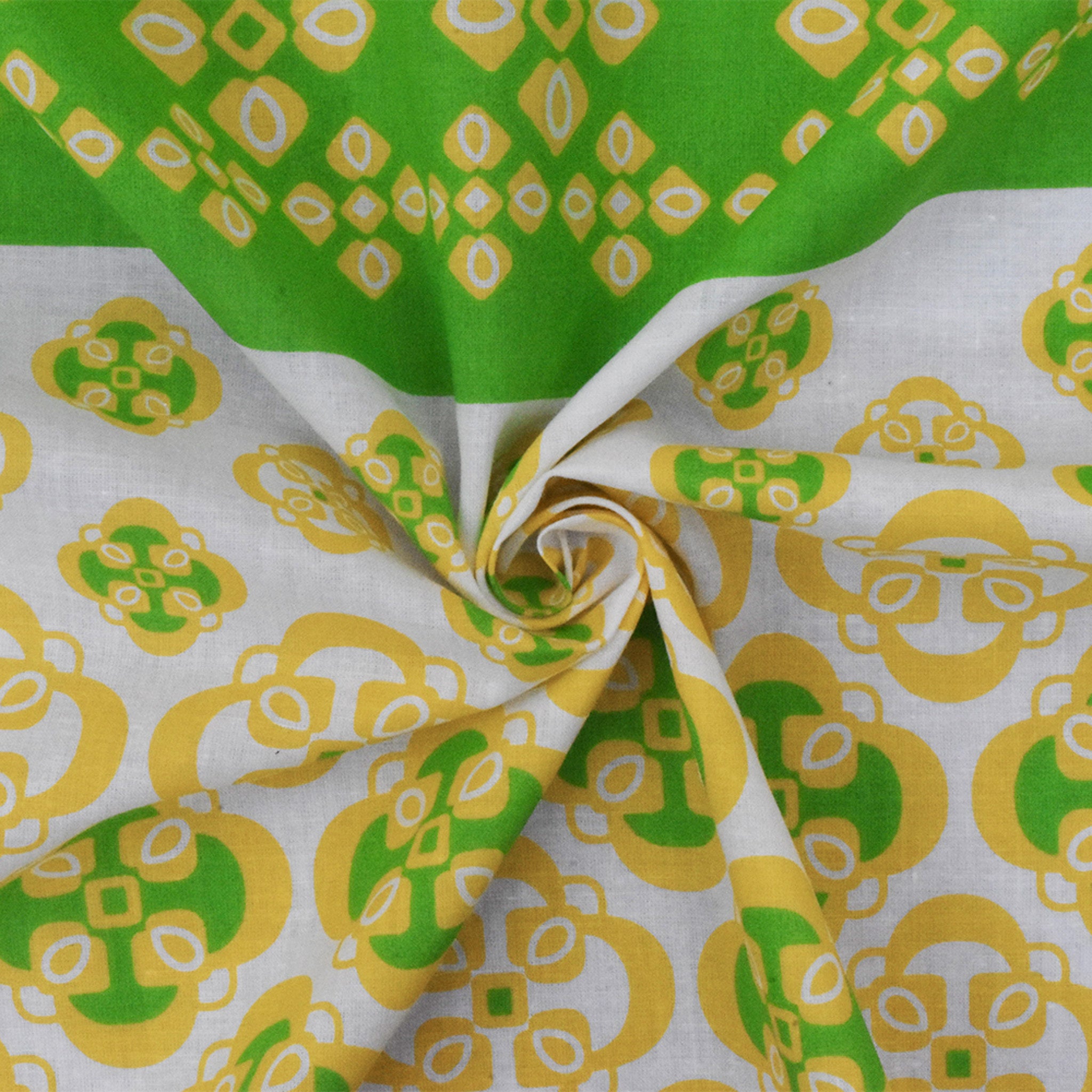 Ivory-Yellow-Green Striped Quatrefoil Printed Cotton Voile Woven Fabric