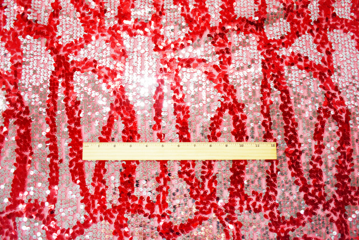 Red-Metallic Nylon-Poly Silver Abstract Sequined Mesh Tulle Fabric