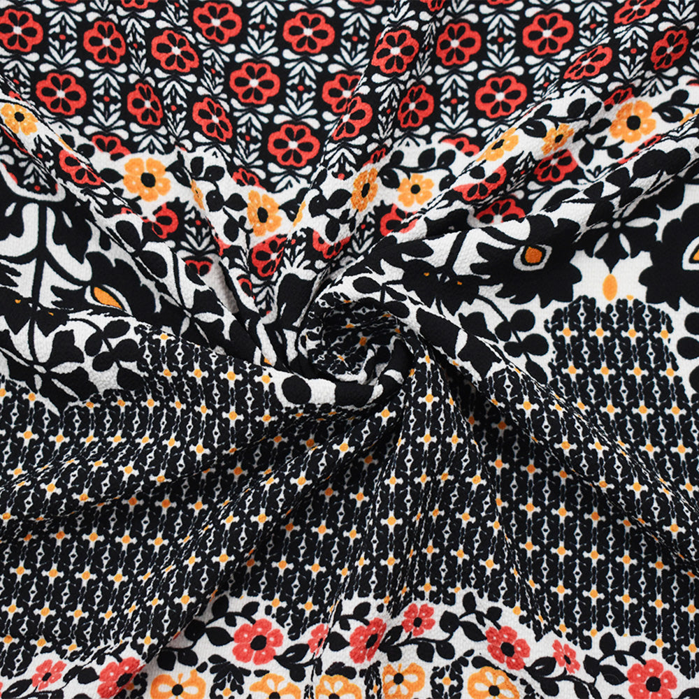 -100% Polyester pebble crepe woven fabric printed with a bordered style pattern with floral motifs. Line if needed.