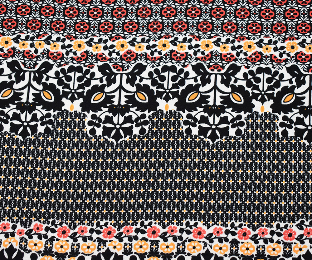 Black-Orange-Multi Poly Floral Border Printed Pebble Crepe Woven Fabric