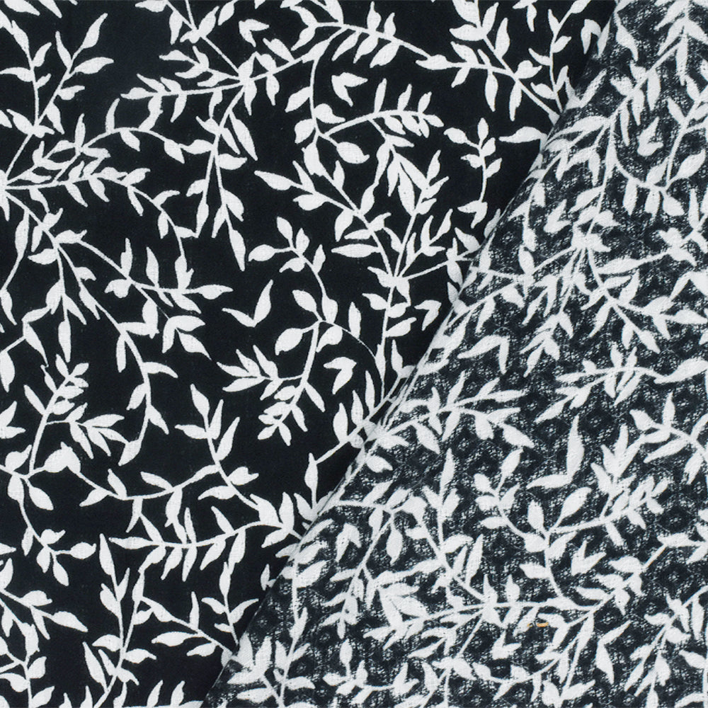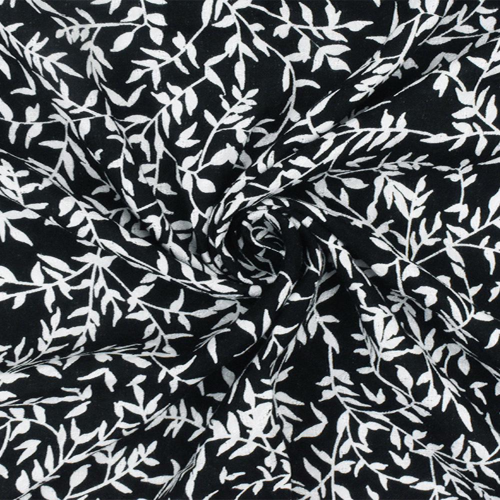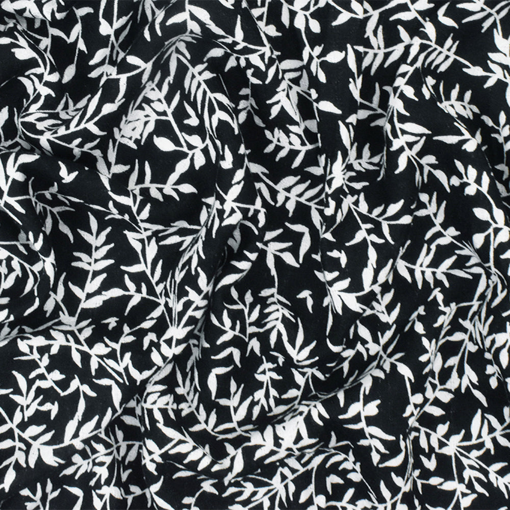 Black-White Famous Designer Leaves Printed Viscose Textured Gauze Fabric