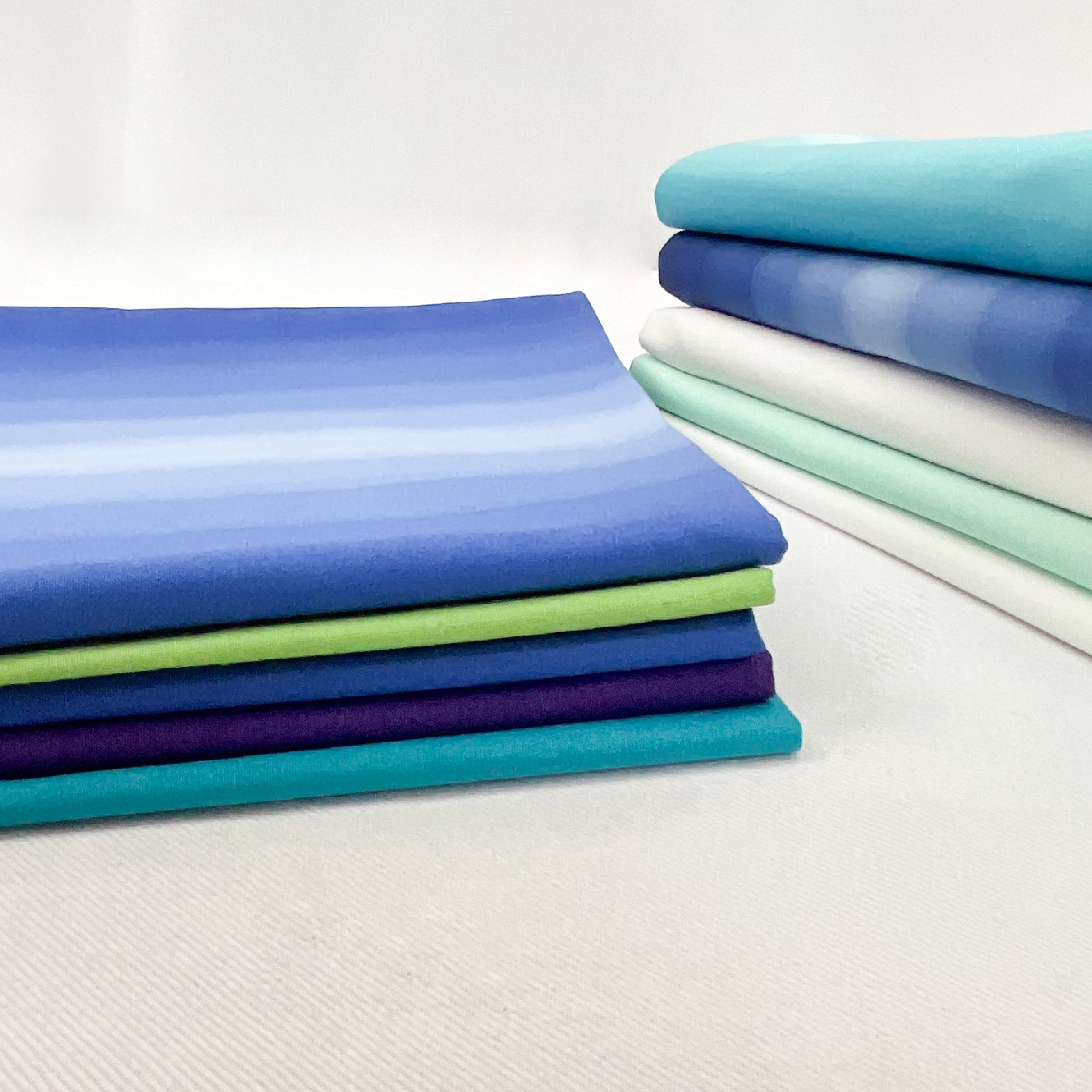 - Bundle fabrics include: 1 3/8 mint green ombre, 5 yards off white solid, 1/2 yd same off white solid, 1 yd water blue ombre, 3/4 yd pear green ombre, 3/4 yd teal ombre, 1 yd purple ombre, 1 yd blue ombre, 2 1/8 yd teal ombre, 2 yds deep blue ombre, 1 3/8 yd same deep blue ombre. Pattern is not included