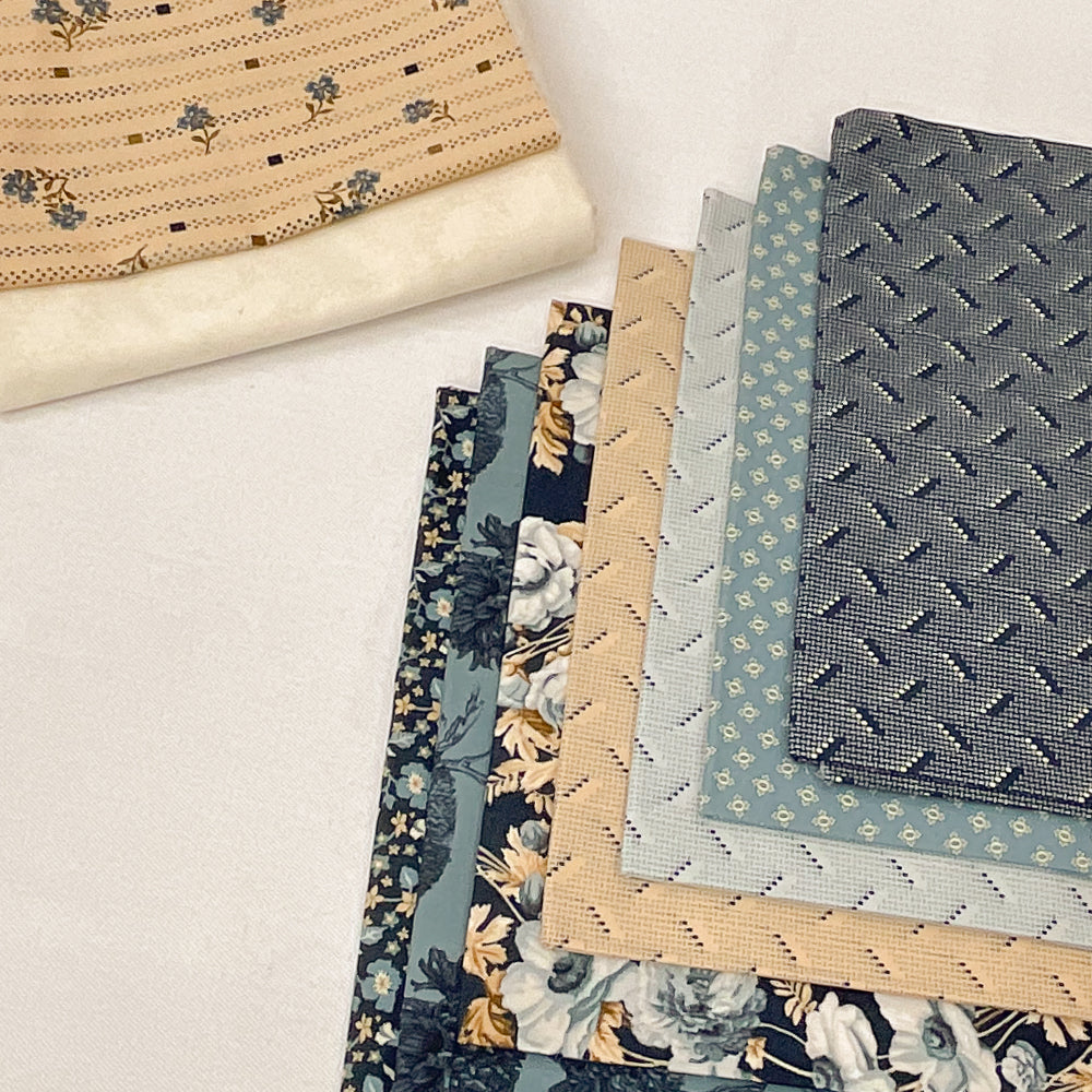 - Bundle fabrics include: 3/4 yd navy ivory dots dashes, 5/8 yd dusty blue yellow circle dot, 1/2 yd gray blue dots dashes, 1/2 yd beige blue dots dashes, 1/2 yd deep blue beige floral, 1/4 yd beige blue floral dot stripe, 1/2 yd deep blue floral, 3/4 yd deep blue yellow ditsy floral, 3 yds beige vine. Pattern is not included
