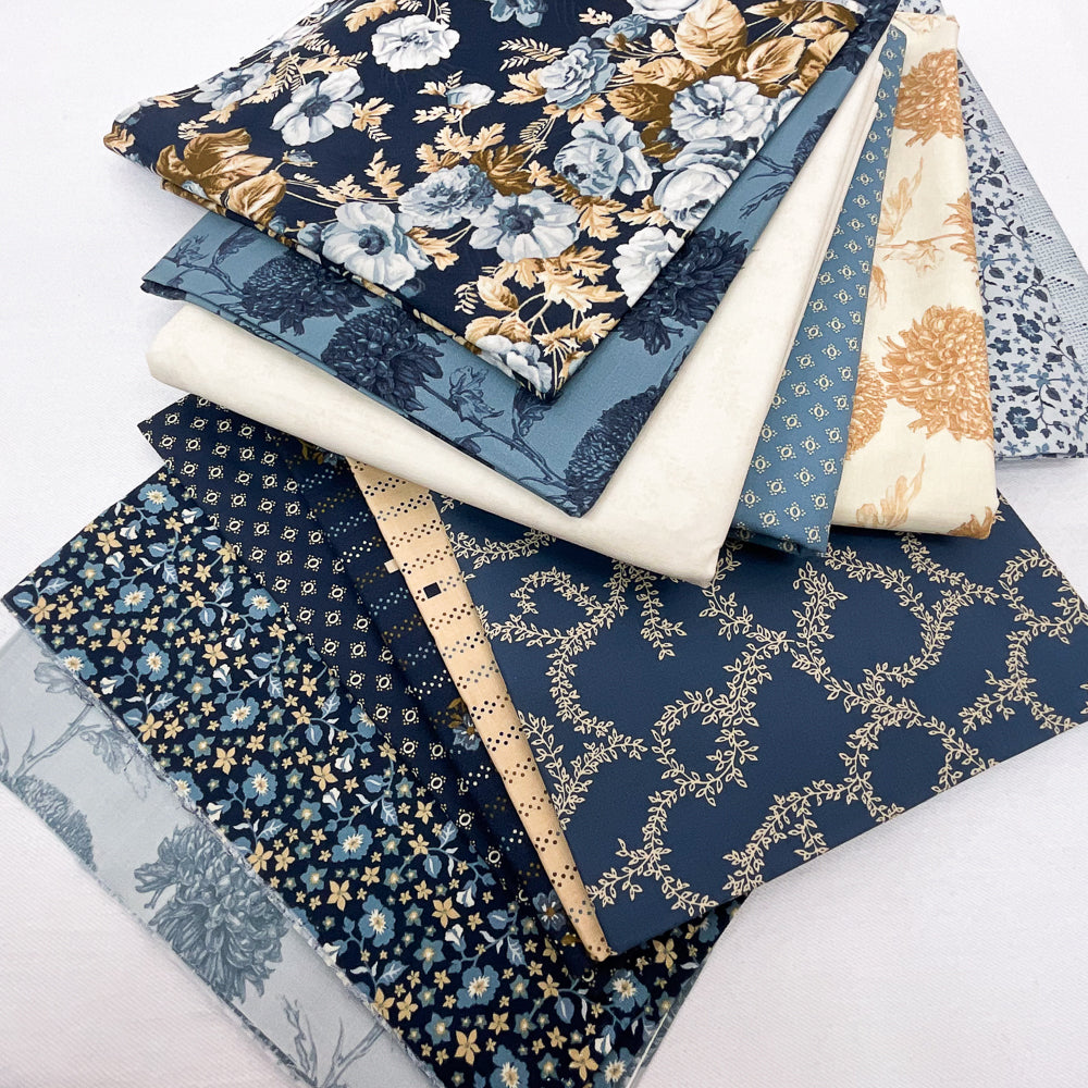 - Bundle fabrics include: 1 yd dusty blue navy floral, 1/4 yd navy blue ditsy floral, 3/8 yd navy ivory yellow circle, 7/8 yd navy brown floral stripe, 3/4 yd beige blue floral stripe, 7/8 yd blue beige vine leaf, 1 1/4 yds light blue navy dot, 3/8 yd light blue navy ditsy floral, 1 1/2 yds beige brown floral, 1 1/8 yds dusty blue yellow circle, 1/4 yd light dark blue floral, 1/2 yd navy ivory floral, 3 yds light beige tonal vine