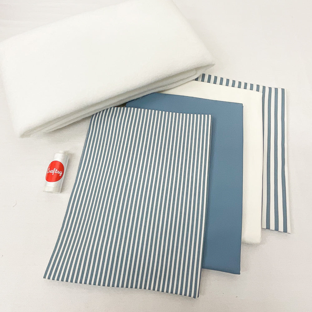 - Kit contents include: Pattern, Warm Company Batting 45"x60", 1 spool white Pima thread 50wt, 6 total yards of fabric including 1 yard of Boundless stripes quarter inch blue, 1 yard of Boundless stripes eighth inch blue, 2 yards of Boundless solids Marshmallow, 2 yards of Boundless solids Wedgewood