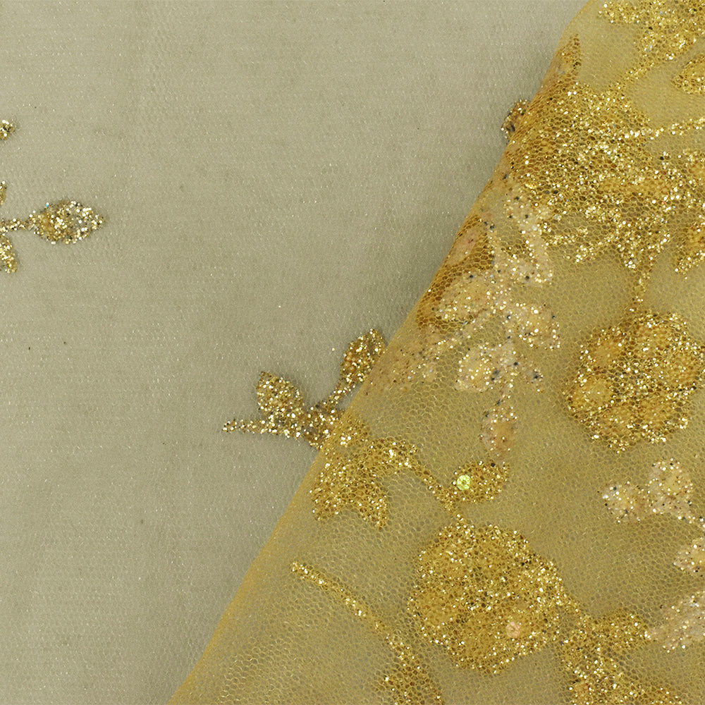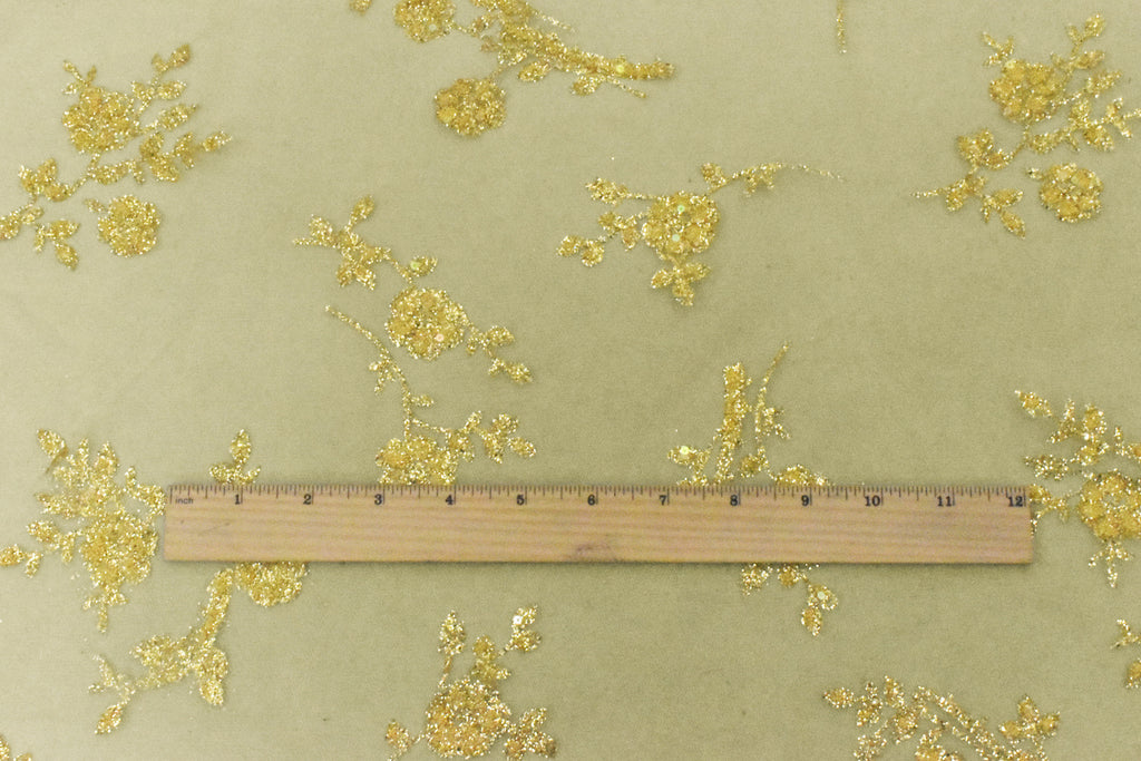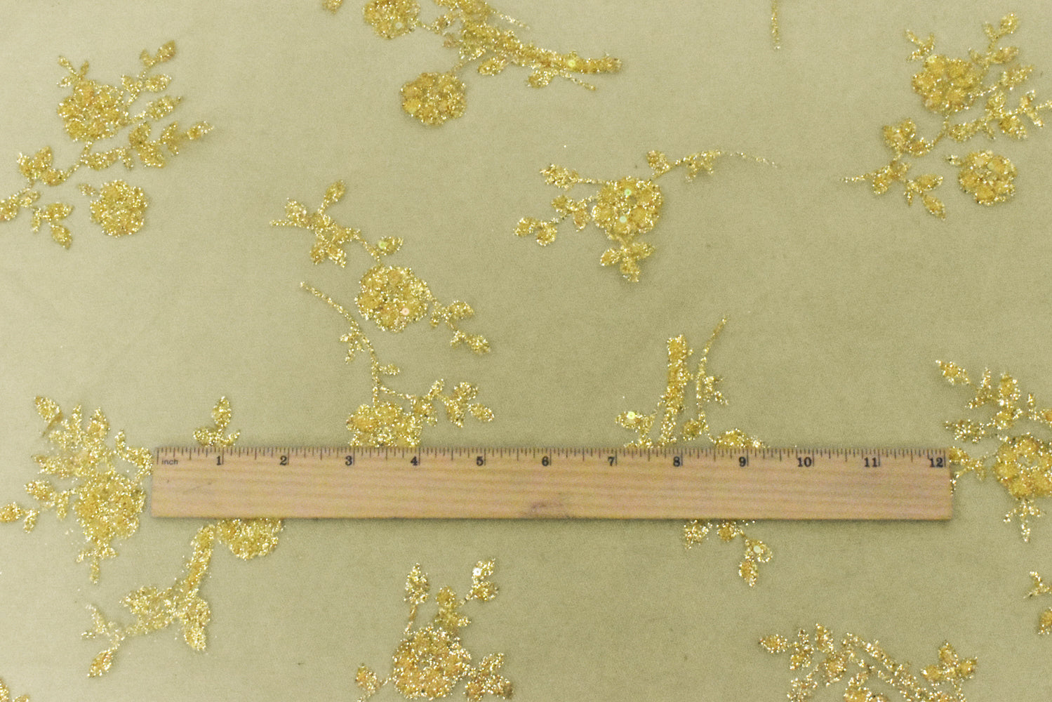 Golden Yellow Floral Sparkles and Bead Poly Mesh Knit Fabric