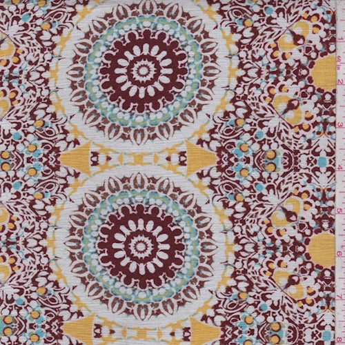 Merlot/Gold/Turquoise Circle Medallion Rayon Crinkle Fabric