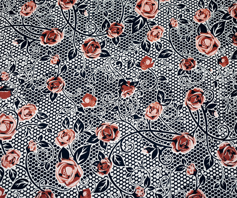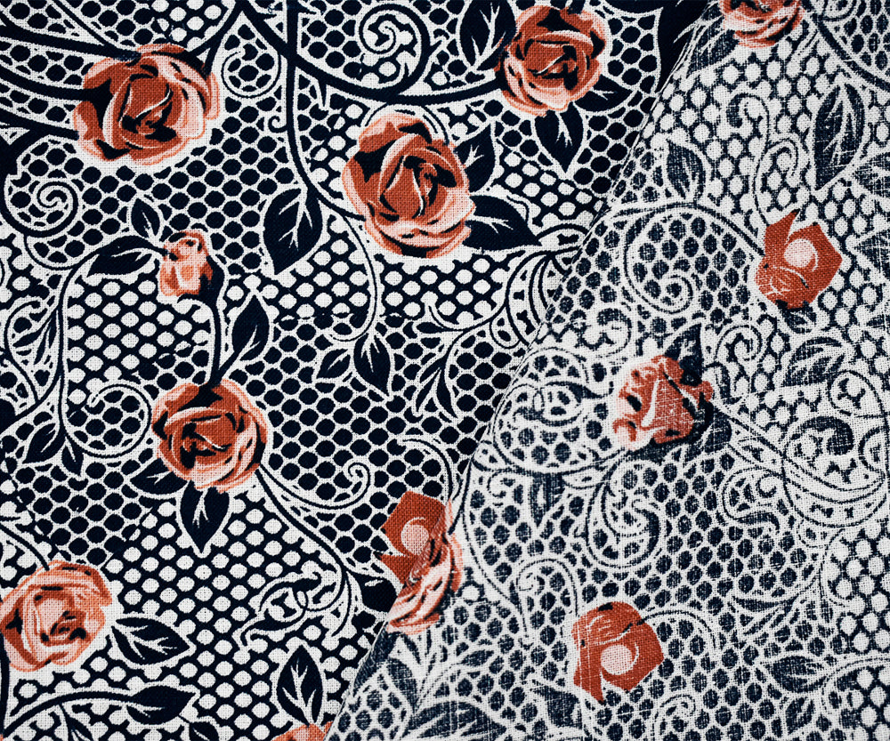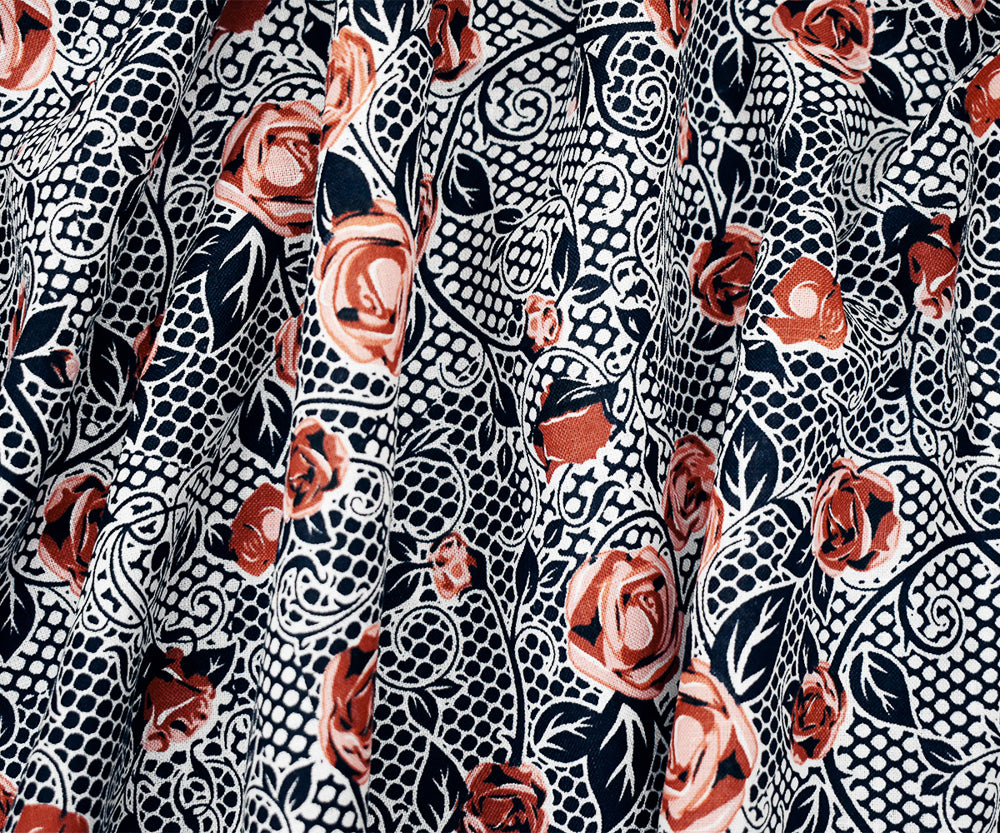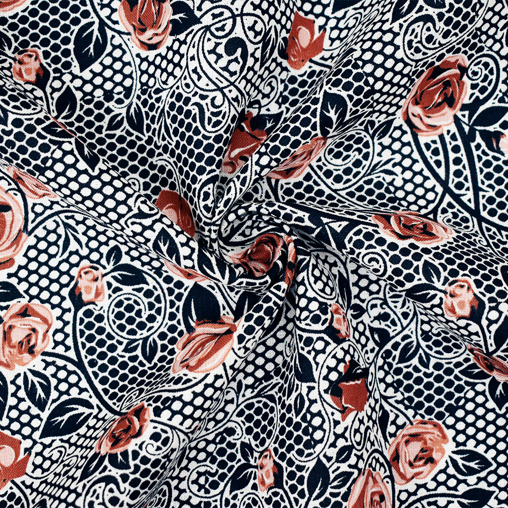 Navy-Peach-Orange Floral Mesh Pattern Printed Linen Woven Fabric