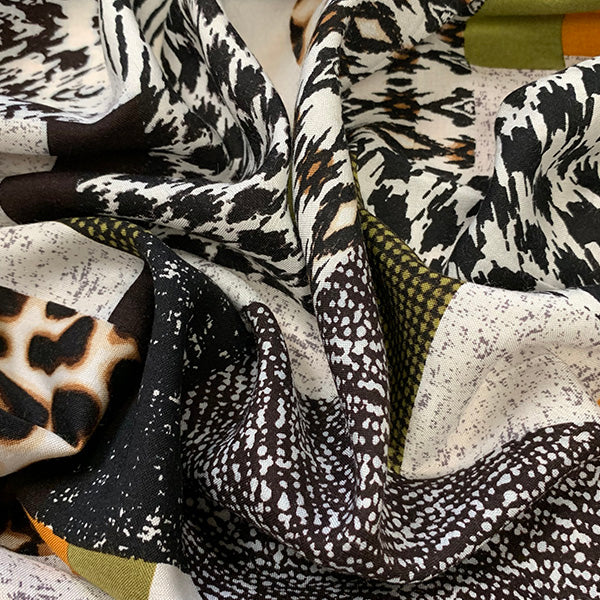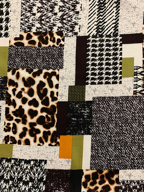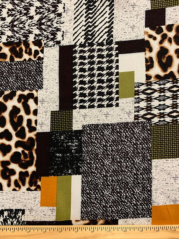 -Orange, Olive, Brown, Copper, Black, White, & Gray Patchwork Print Rayon Challis Fabric