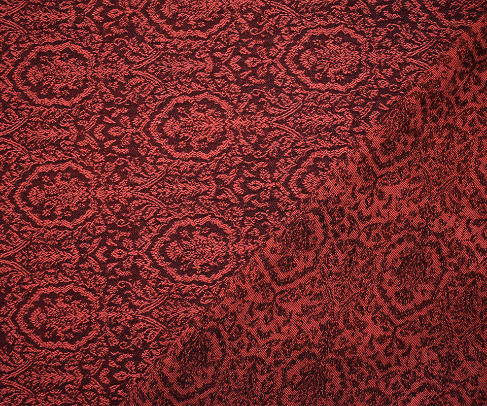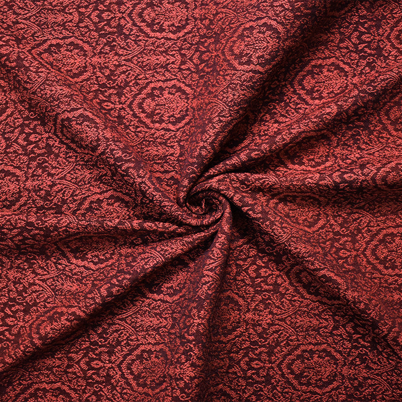 -240 gsm, Rayon blend stretch spandex red tonal jacquard woven fabric with baroque and crest-like elements