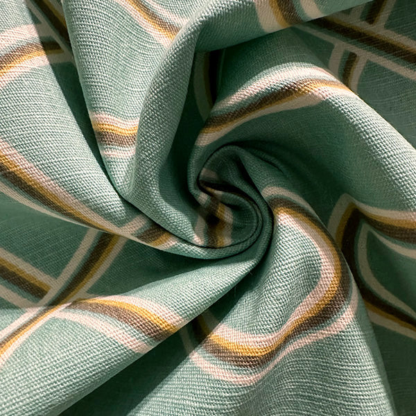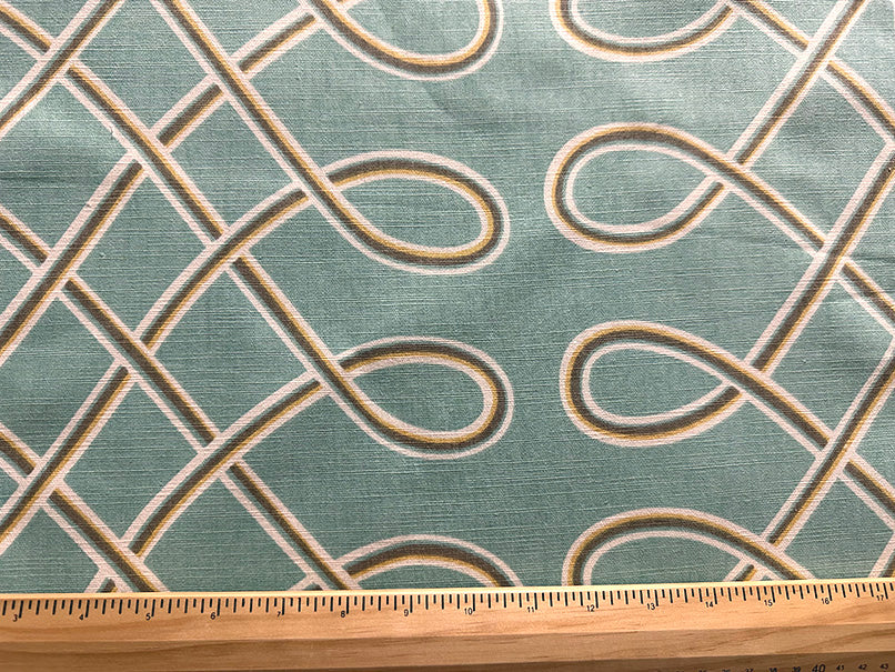 -White, Olive Green, Gold Loops on Sea Green Printed Cotton Linen Drapery Fabric by Robert Allen (Border Print)